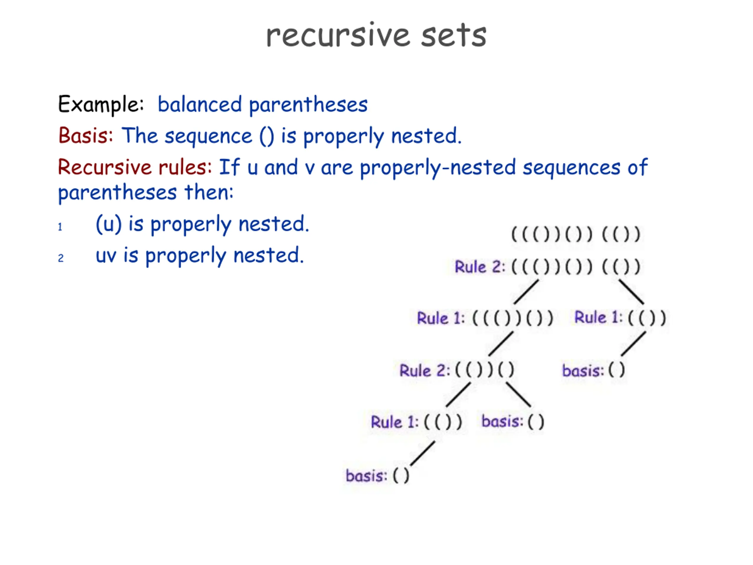 recursive sets Some sets are most naturally specified by recursive definitions. A recursive definition of a set shows how to construct elements in the set by putting together simpler elements. Example: balanced parentheses Basis: The sequence () is properly nested. Recursive rules: If u and v are properly-nested sequences of parentheses then: (u) is properly nested. uv is properly nested. 1 2