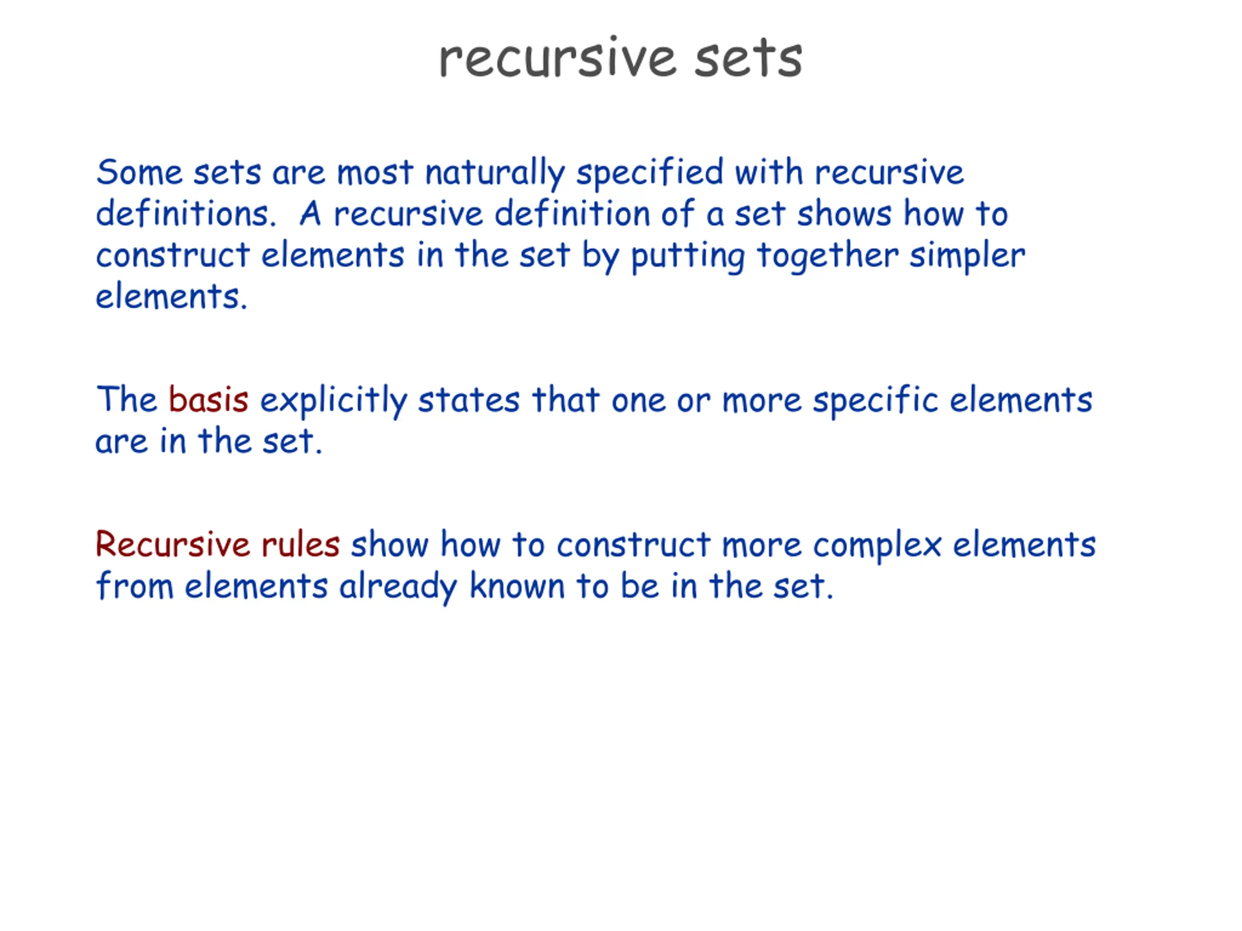 recursive sets Some sets are most naturally specified with recursive definitions. A recursive definition of a set shows how to construct elements in the set by putting together simpler elements. The basis explicitly states that one or more specific elements are in the set. Recursive rules show how to construct more complex elements from elements already known to be in the set.