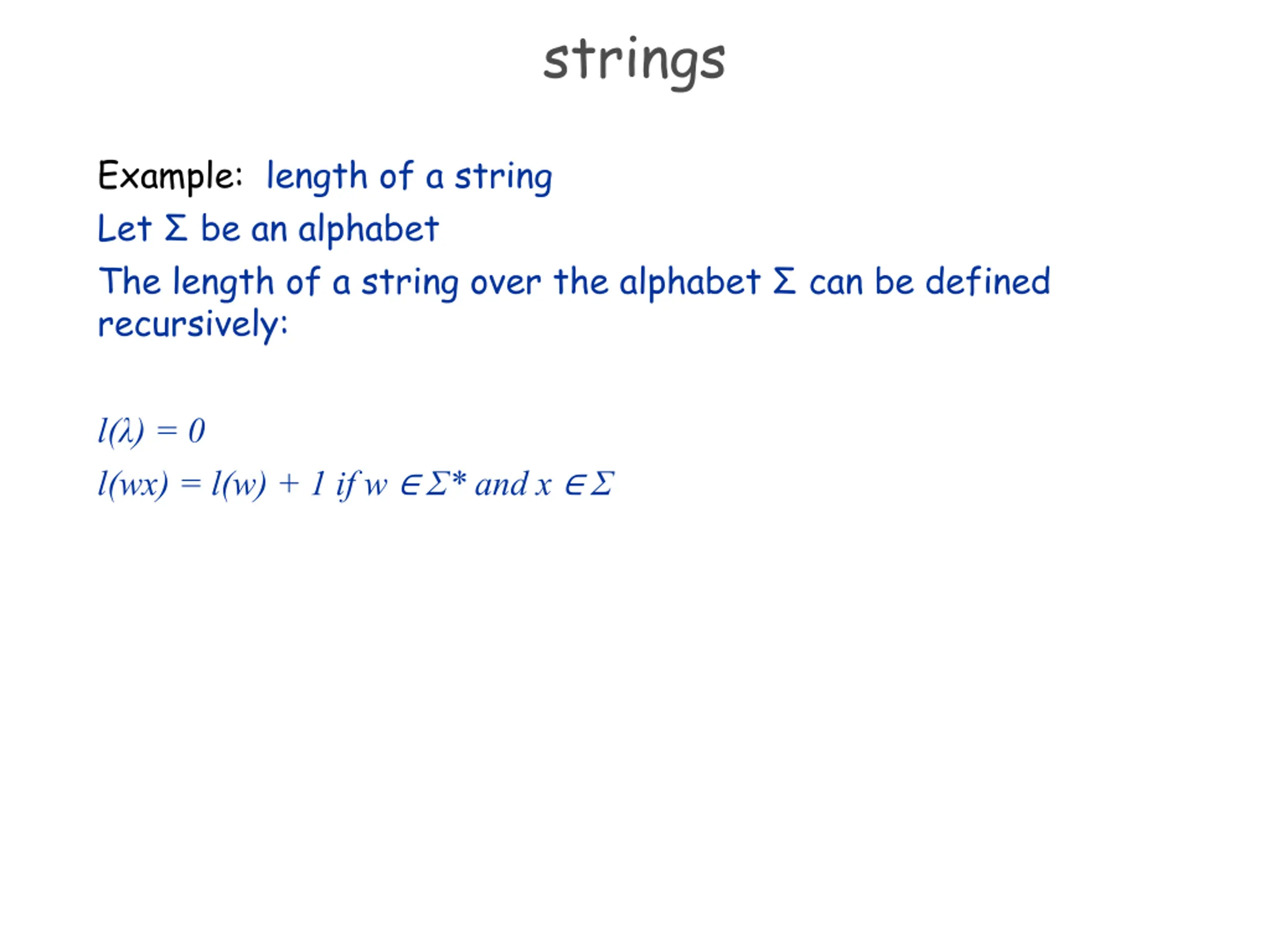strings Example: length of a string Let be an alphabet The length of a string over the alphabet can be defined recursively: l( ) = 0 l(wx) = l(w) + 1 if w * and x