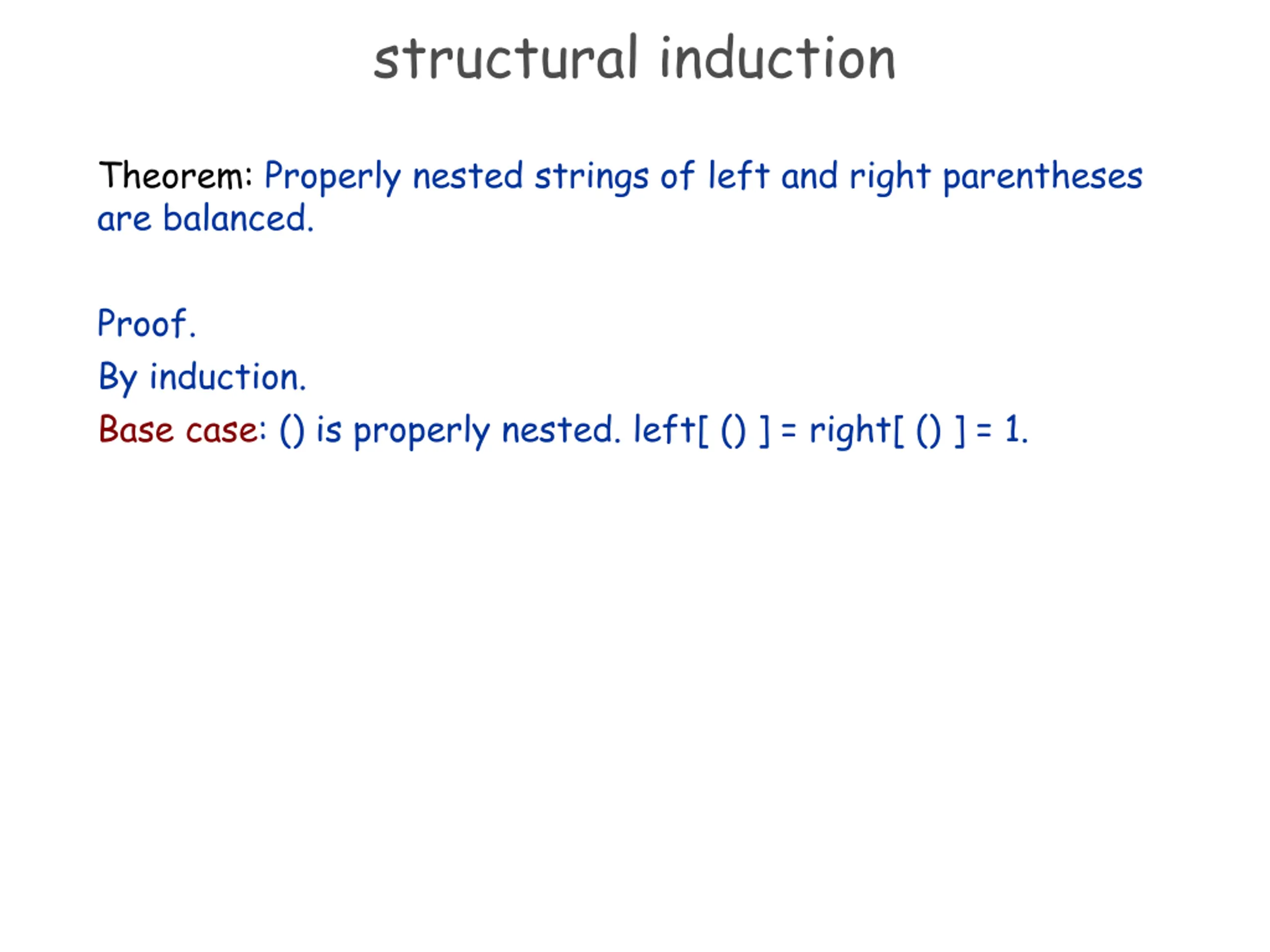 structural induction Theorem: Properly nested strings of left and right parentheses are balanced. Proof. By induction. Base case: () is properly nested. left[ () ] = right[ () ] = 1.