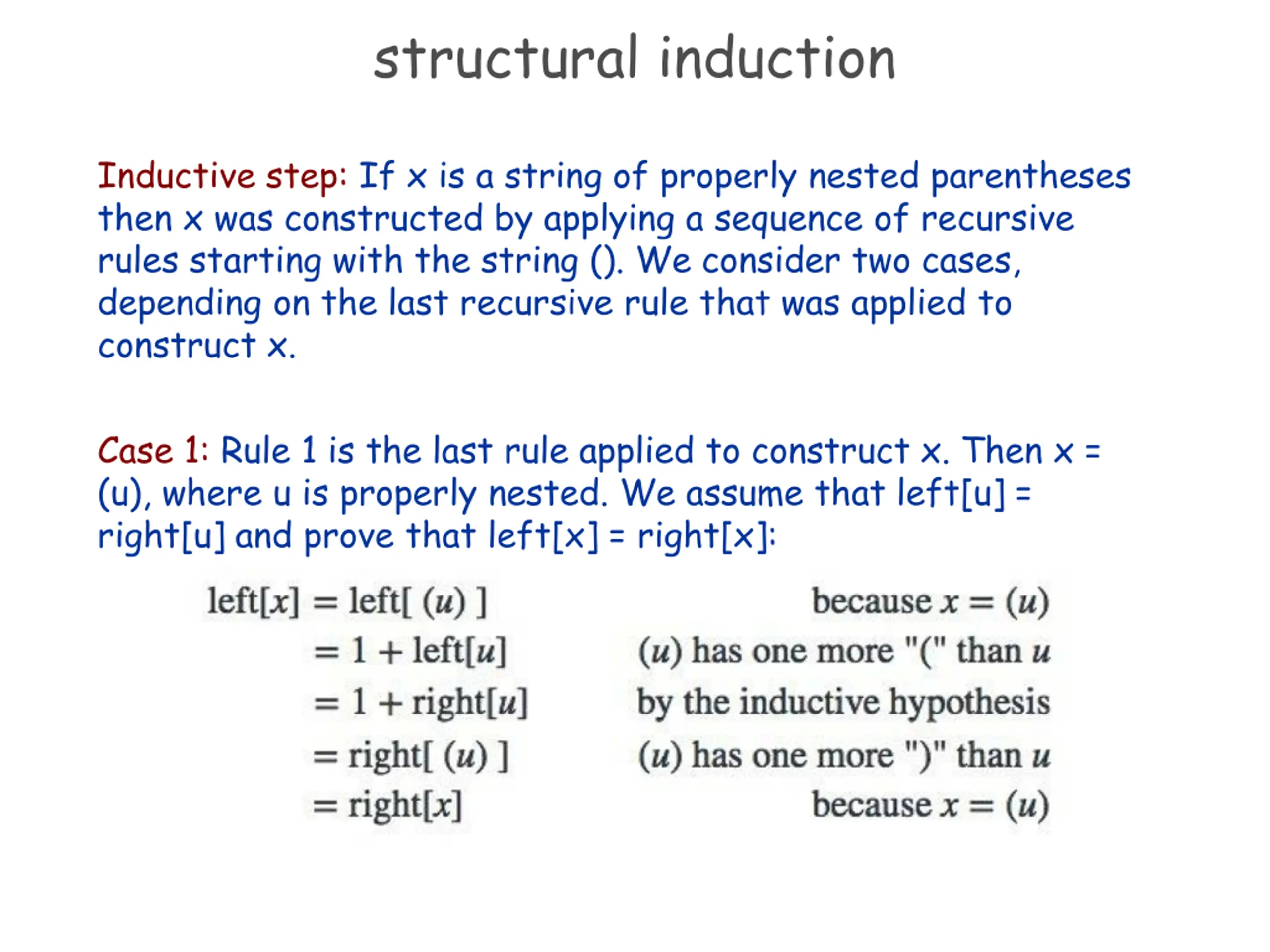 structural induction Inductive step: If x is a string of properly nested parentheses then x was constructed by applying a sequence of recursive rules starting with the string (). We consider two cases, depending on the last recursive rule that was applied to construct x. Case 1: Rule 1 is the last rule applied to construct x. Then x = (u), where u is properly nested. We assume that left[u] = right[u] and prove that left[x] = right[x]: