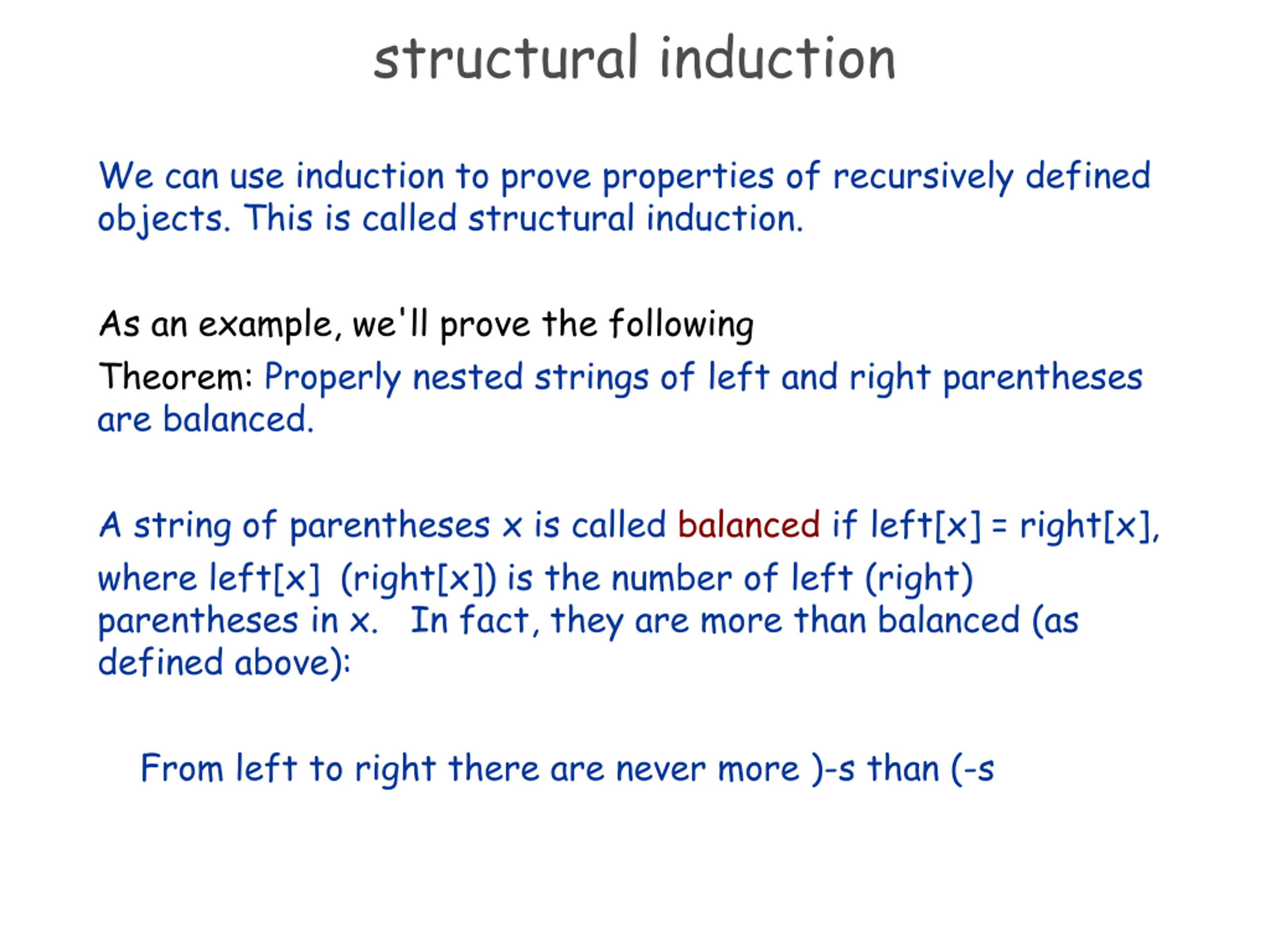 structural induction We can use induction to prove properties of recursively defined objects. This is called structural induction. As an example, we'll prove the following Theorem: Properly nested strings of left and right parentheses are balanced. A string of parentheses x is called balanced if left[x] = right[x], where left[x] (right[x]) is the number of left (right) parentheses in x. In fact, they are more than balanced (as defined above): From left to right there are never more )-s than (-s