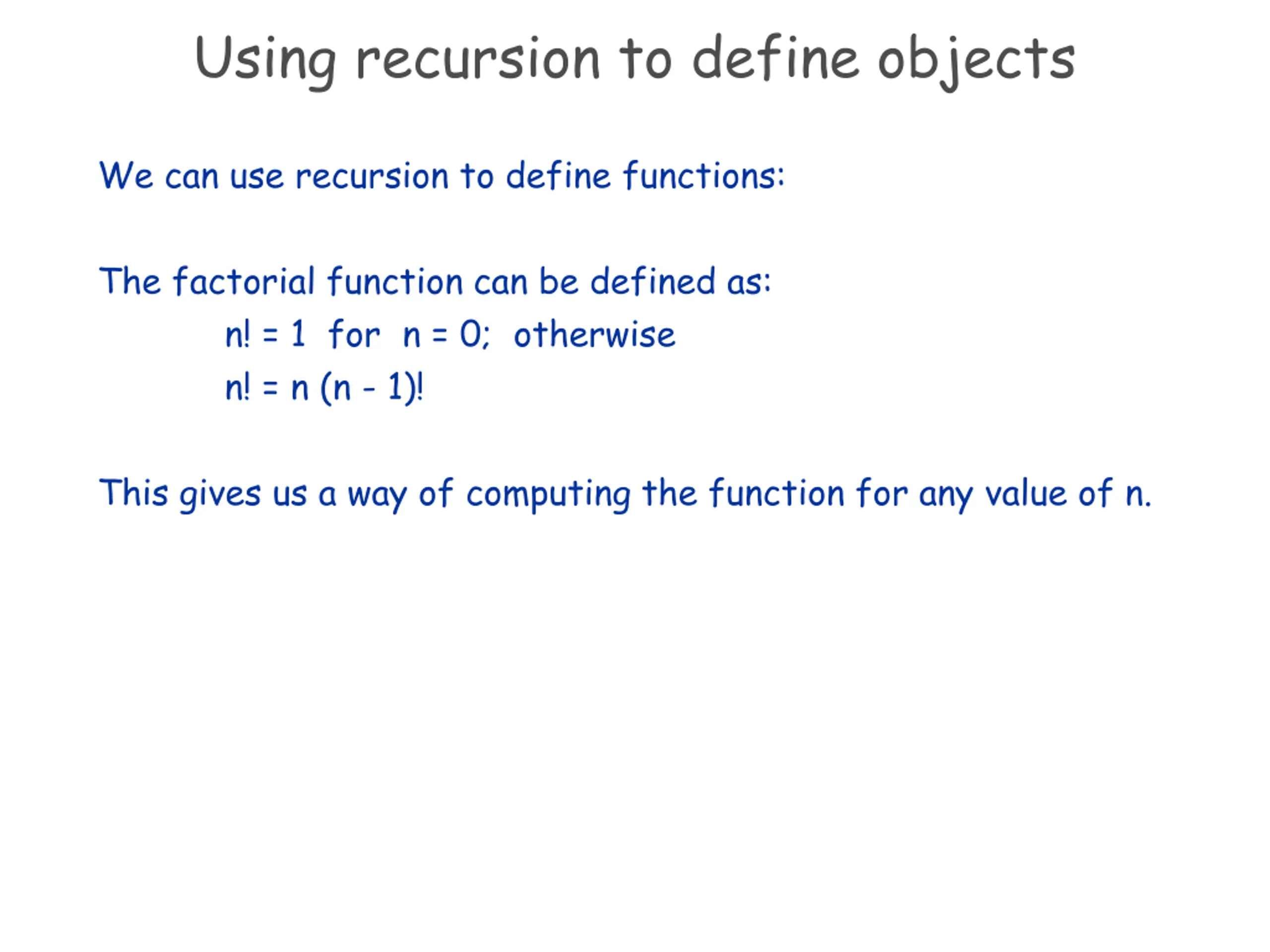 Using recursion to define objects We can use recursion to define functions: The factorial function can be defined as: n! = 1 for n = 0; otherwise n! = n (n - 1)! This gives us a way of computing the function for any value of n.