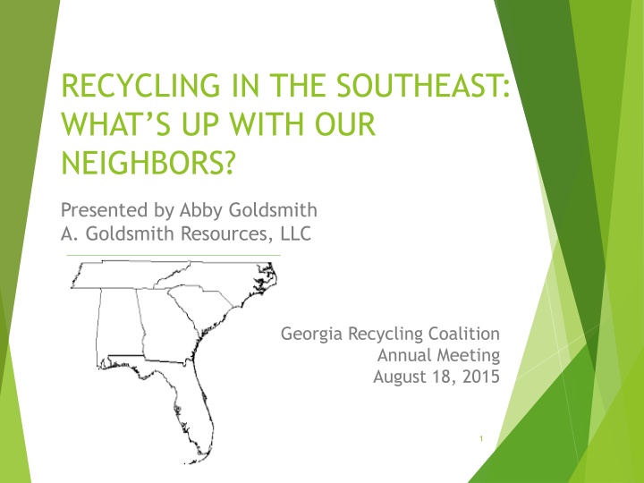 RECYCLING IN THE SOUTHEAST: WHAT S UP WITH OUR NEIGHBORS? Presented by Abby Goldsmith A. Goldsmith Resources, LLC Georgia Recycling Coalition Annual Meeting August 18, 2015 1