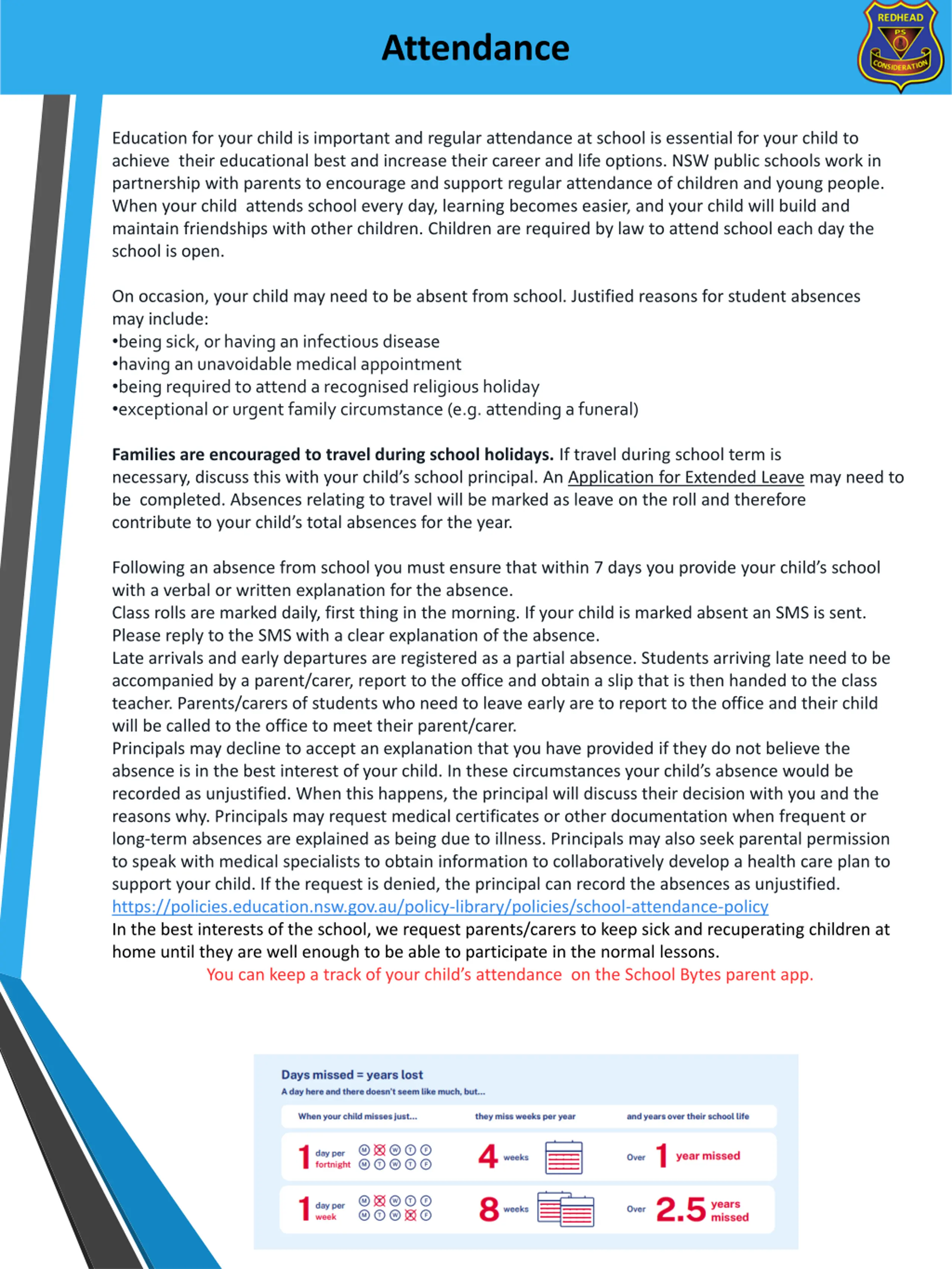Attendance Education for your child is important and regular attendance at school is essential for your child to achieve their educational best and increase their career and life options. NSW public schools work in partnership with parents to encourage and support regular attendance of children and young people. When your child attends school every day, learning becomes easier, and your child will build and maintain friendships with other children. Children are required by law to attend school each day the school is open. On occasion, your child may need to be absent from school. Justified reasons for student absences may include: being sick, or having an infectious disease having an unavoidable medical appointment being required to attend a recognised religious holiday exceptional or urgent family circumstance (e.g. attending a funeral) Families are encouraged to travel during school holidays. If travel during school term is necessary, discuss this with your child s school principal. An Application for Extended Leave may need to be completed. Absences relating to travel will be marked as leave on the roll and therefore contribute to your child s total absences for the year. Following an absence from school you must ensure that within 7 days you provide your child s school with a verbal or written explanation for the absence. Class rolls are marked daily, first thing in the morning. If your child is marked absent an SMS is sent. Please reply to the SMS with a clear explanation of the absence. Late arrivals and early departures are registered as a partial absence. Students arriving late need to be accompanied by a parent/carer, report to the office and obtain a slip that is then handed to the class teacher. Parents/carers of students who need to leave early are to report to the office and their child will be called to the office to meet their parent/carer. Principals may decline to accept an explanation that you have provided if they do not believe the absence is in the best interest of your child. In these circumstances your child s absence would be recorded as unjustified. When this happens, the principal will discuss their decision with you and the reasons why. Principals may request medical certificates or other documentation when frequent or long-term absences are explained as being due to illness. Principals may also seek parental permission to speak with medical specialists to obtain information to collaboratively develop a health care plan to support your child. If the request is denied, the principal can record the absences as unjustified. https://policies.education.nsw.gov.au/policy-library/policies/school-attendance-policy In the best interests of the school, we request parents/carers to keep sick and recuperating children at home until they are well enough to be able to participate in the normal lessons. You can keep a track of your child s attendance on the School Bytes parent app.