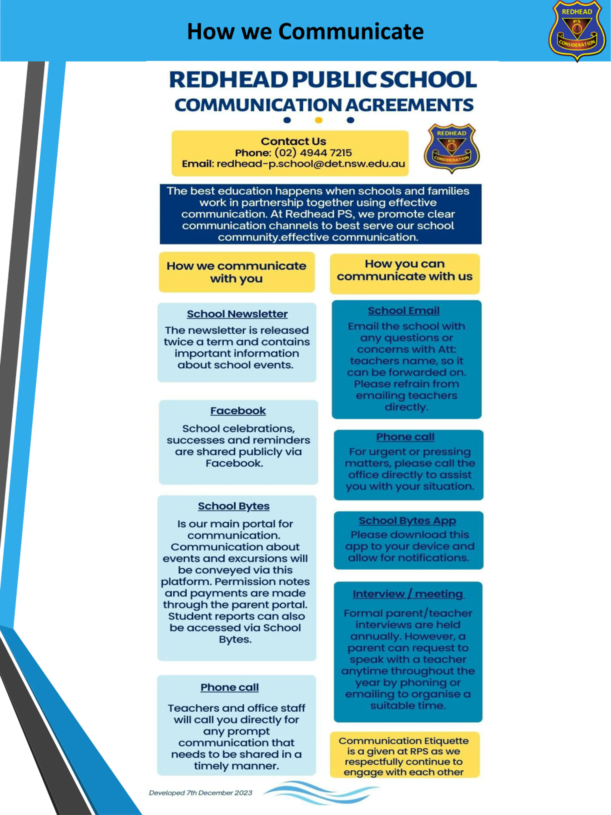 School and student behaviour expectations Redhead Public School is committed to explicitly teaching and modelling positive behaviour, and to supporting all students to be engaged with their learning. Our school reinforces this through personalised school values/student behaviour code and the Department of Education's Positive Behaviour for learning (PBL) framework. Values Education is discussed in our weekly Monday morning assembly in the hall at 9:10am. Parents/carers are more than welcome to attend. Each week teachers discuss, model and reinforce our value focus. Posters are displayed in every classroom and around the outdoor school environment for transparency and to remind students of our student behaviour code. On our school website detailed information can be located regarding : https://redhead-p.schools.nsw.gov.au/about-our- school/parent-information.html