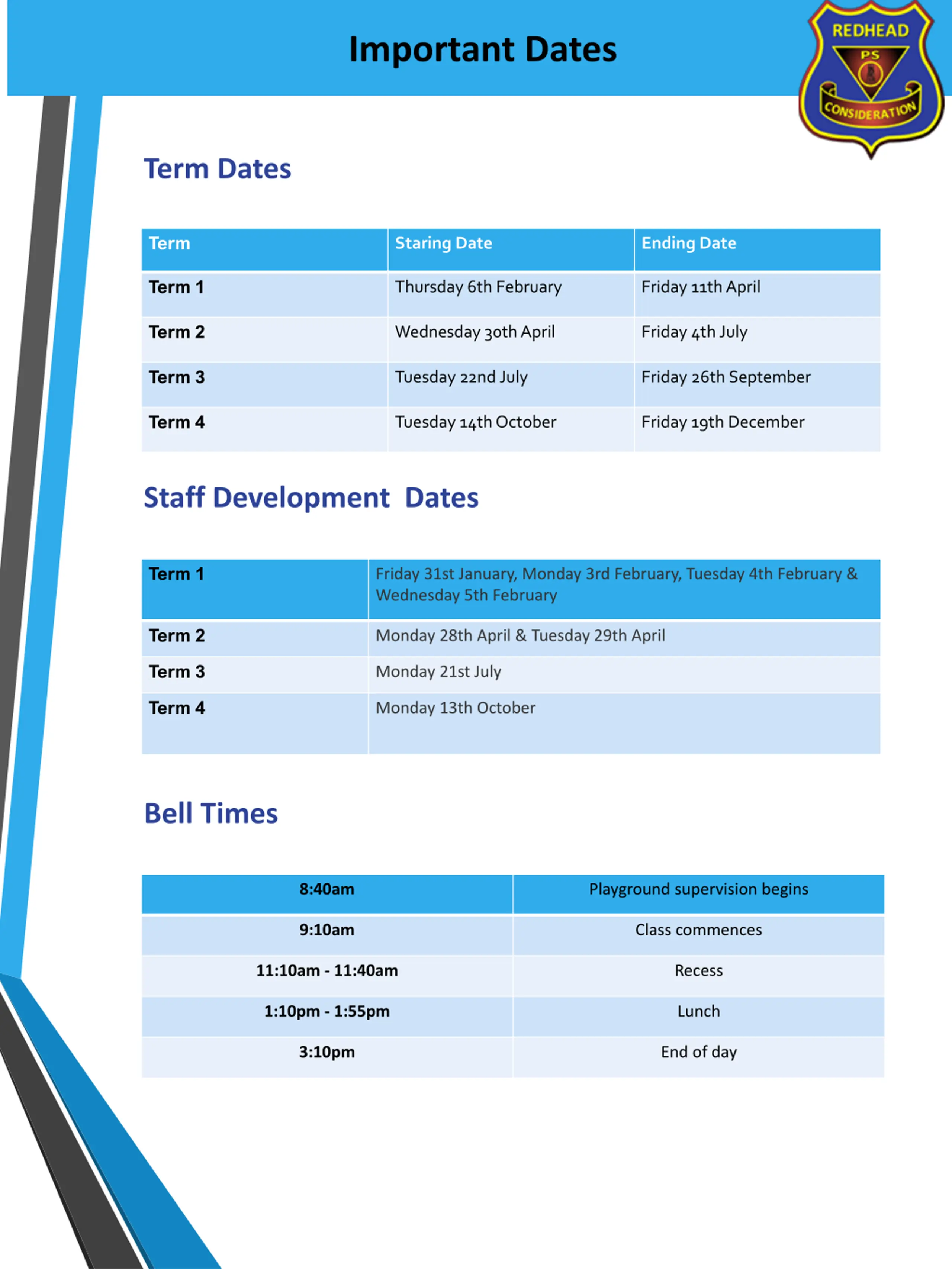 Important Dates Term Dates Term Staring Date Ending Date Term 1 Thursday 6th February Friday 11th April Term 2 Wednesday 30th April Friday 4th July Term 3 Tuesday 22nd July Friday 26th September Term 4 Tuesday 14th October Friday 19th December Staff Development Dates Term 1 Friday 31st January, Monday 3rd February, Tuesday 4th February & Wednesday 5th February Term 2 Monday 28th April & Tuesday 29th April Term 3 Monday 21st July Term 4 Monday 13th October Bell Times 8:40am Playground supervision begins 9:10am Class commences 11:10am - 11:40am Recess 1:10pm - 1:55pm Lunch 3:10pm End of day