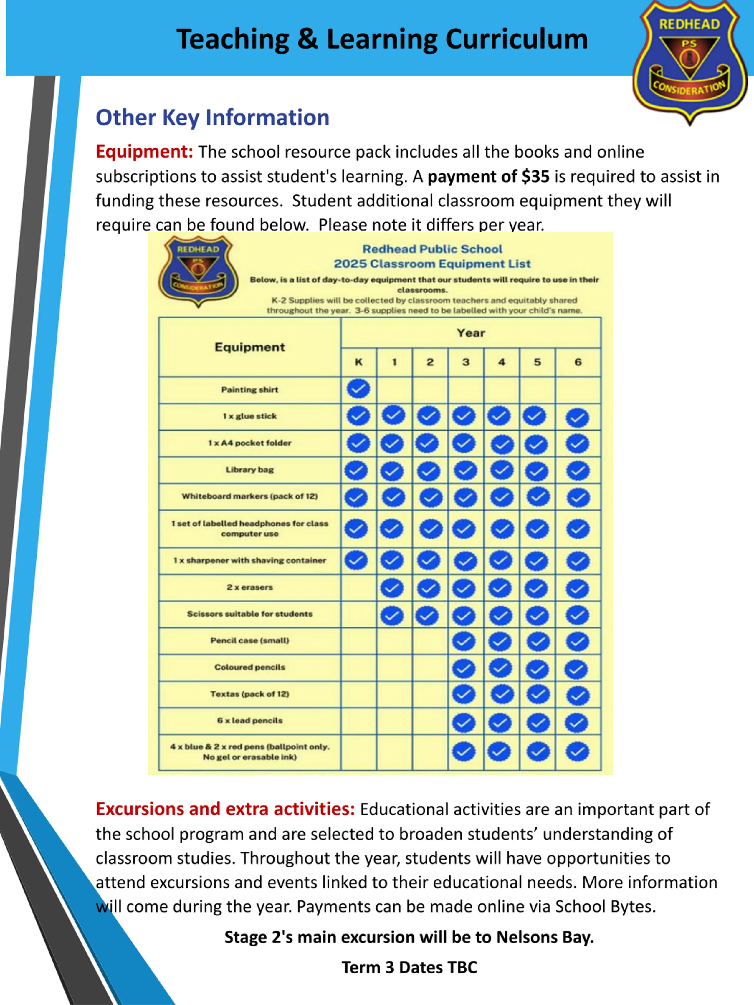 Teaching & Learning Curriculum Other Key Information Equipment: The school resource pack includes all the books and online subscriptions to assist student's learning. A payment of $35 is required to assist in funding these resources. Student additional classroom equipment they will require can be found below. Please note it differs per year. Excursions and extra activities: Educational activities are an important part of the school program and are selected to broaden students understanding of classroom studies. Throughout the year, students will have opportunities to attend excursions and events linked to their educational needs. More information will come during the year. Payments can be made online via School Bytes. Stage 2's main excursion will be to Nelsons Bay. Term 3 Dates TBC