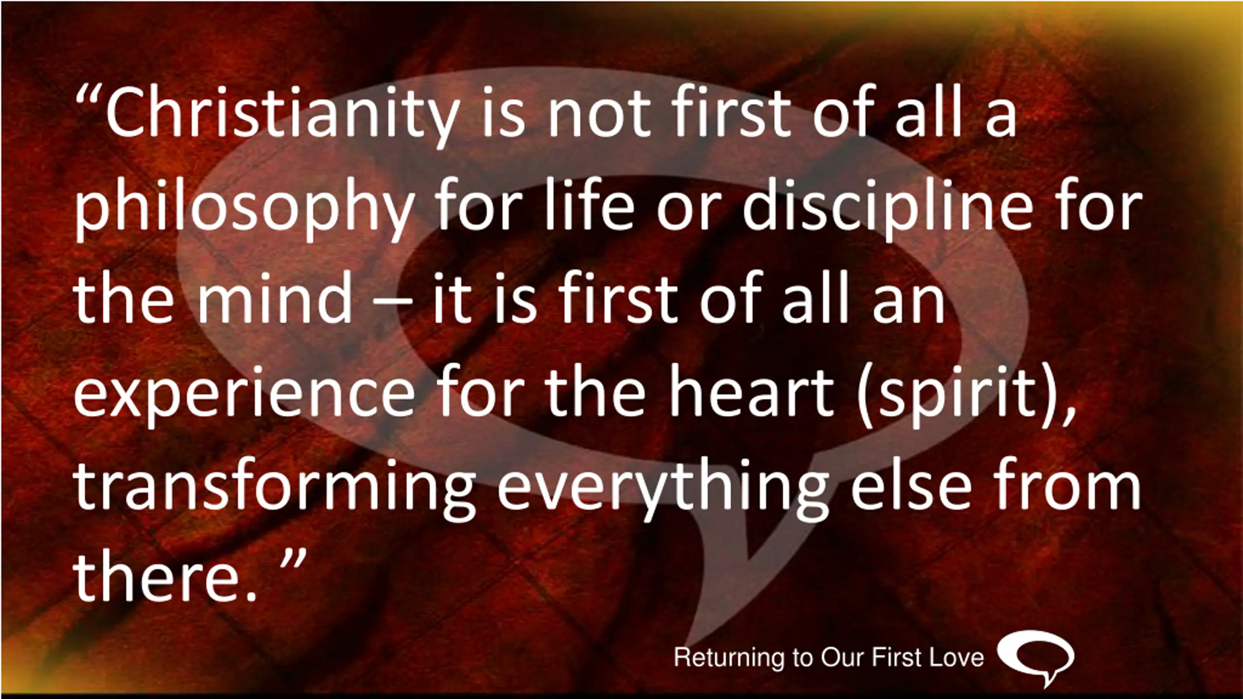 Christianity is not first of all a philosophy for life or discipline for the mind it is first of all an experience for the heart (spirit), transforming everything else from there. Returning to Our First Love