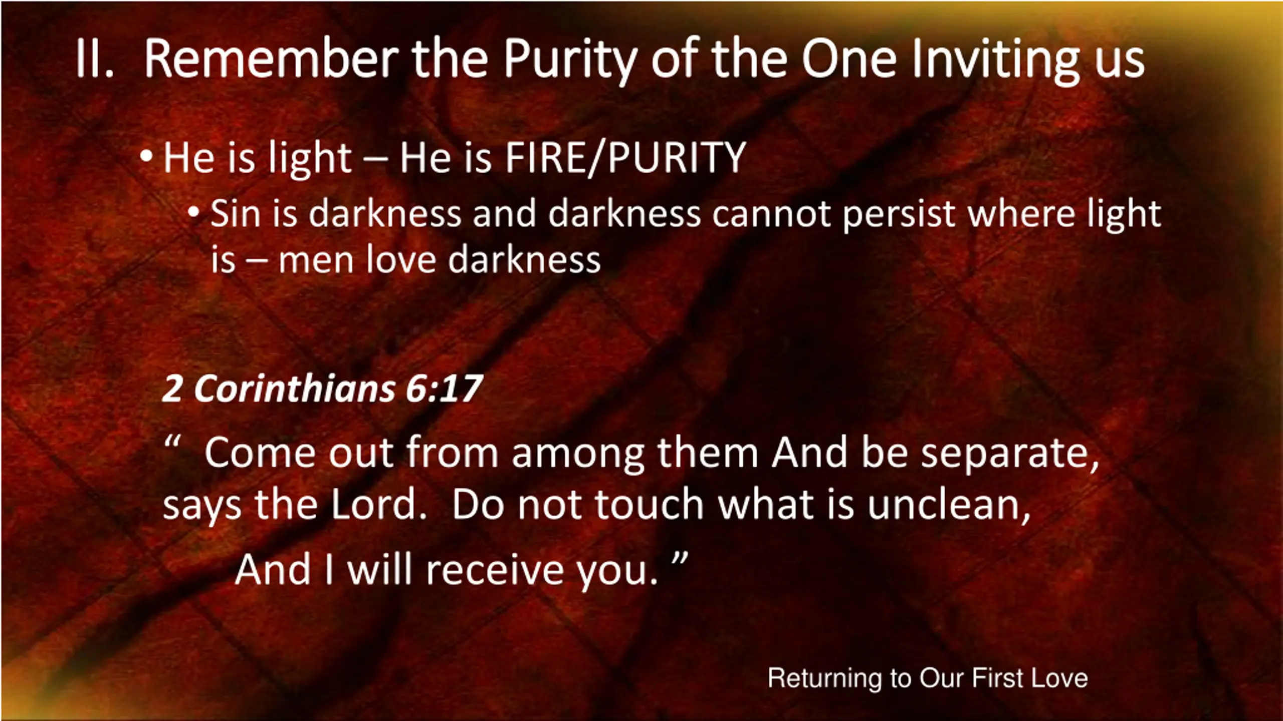 II. Remember the Purity of the One Inviting us II. Remember the Purity of the One Inviting us He is light He is FIRE/PURITY Sin is darkness and darkness cannot persist where light is men love darkness 2 Corinthians 6:17 Come out from among them And be separate, says the Lord. Do not touch what is unclean, And I will receive you. Returning to Our First Love
