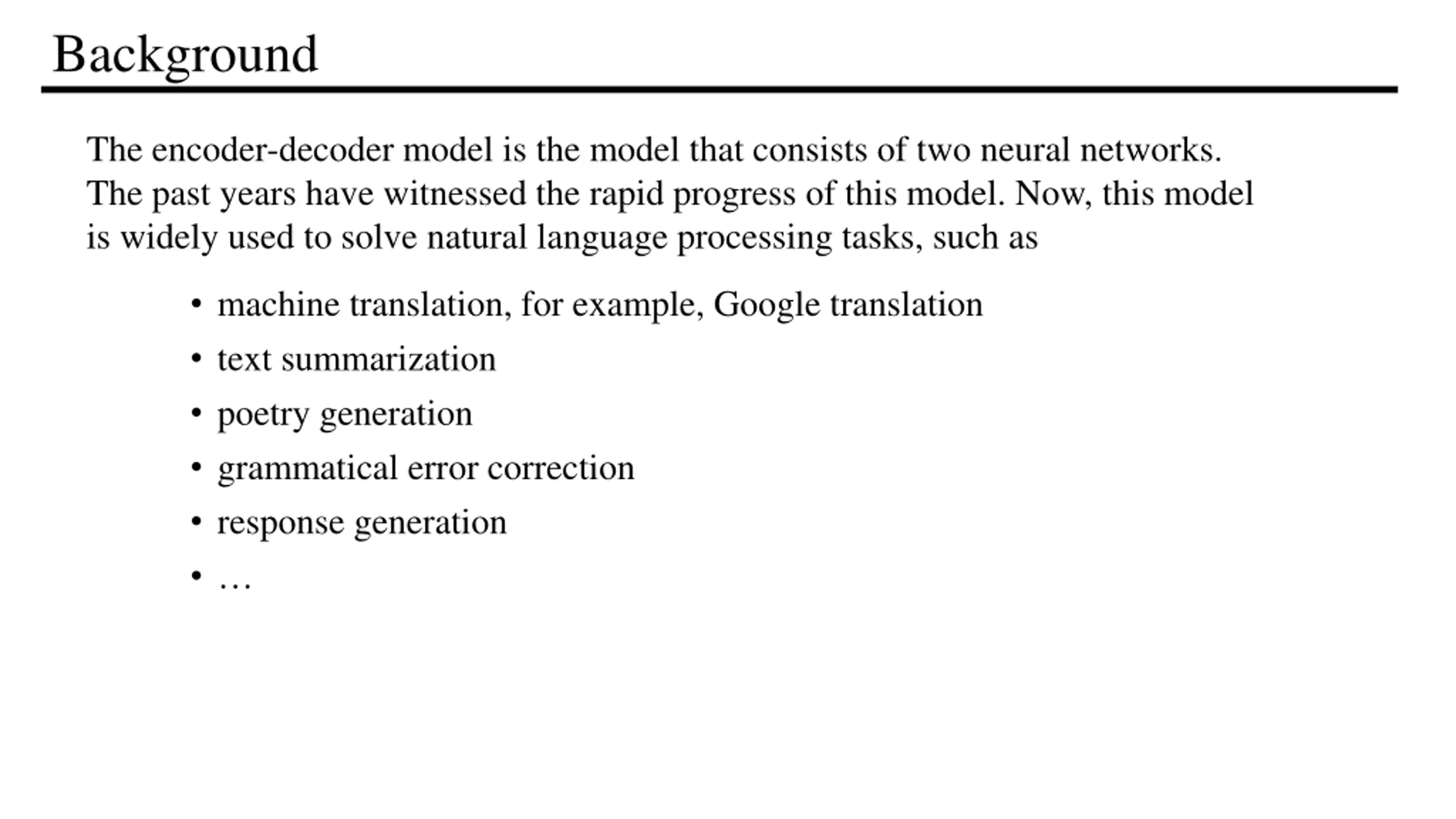 Background The encoder-decoder model is the model that consists of two neural networks. The past years have witnessed the rapid progress of this model. Now, this model is widely used to solve natural language processing tasks, such as machine translation, for example, Google translation text summarization poetry generation grammatical error correction response generation