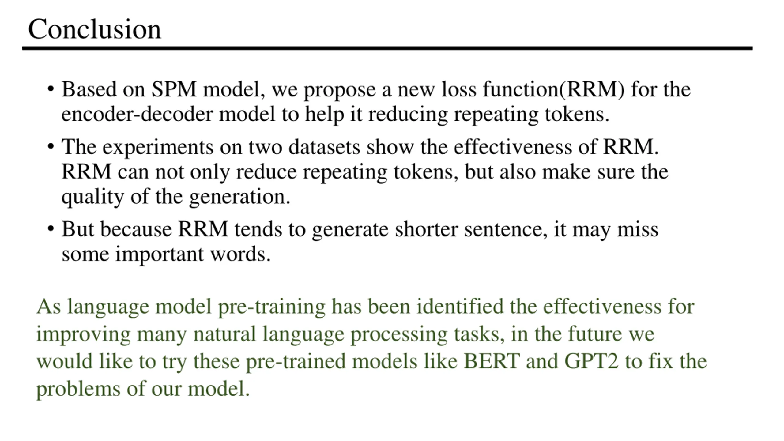 Conclusion Based on SPM model, we propose a new loss function(RRM) for the encoder-decoder model to help it reducing repeating tokens. The experiments on two datasets show the effectiveness of RRM. RRM can not only reduce repeating tokens, but also make sure the quality of the generation. But because RRM tends to generate shorter sentence, it may miss some important words. As language model pre-training has been identified the effectiveness for improving many natural language processing tasks, in the future we would like to try these pre-trained models like BERT and GPT2 to fix the problems of our model.