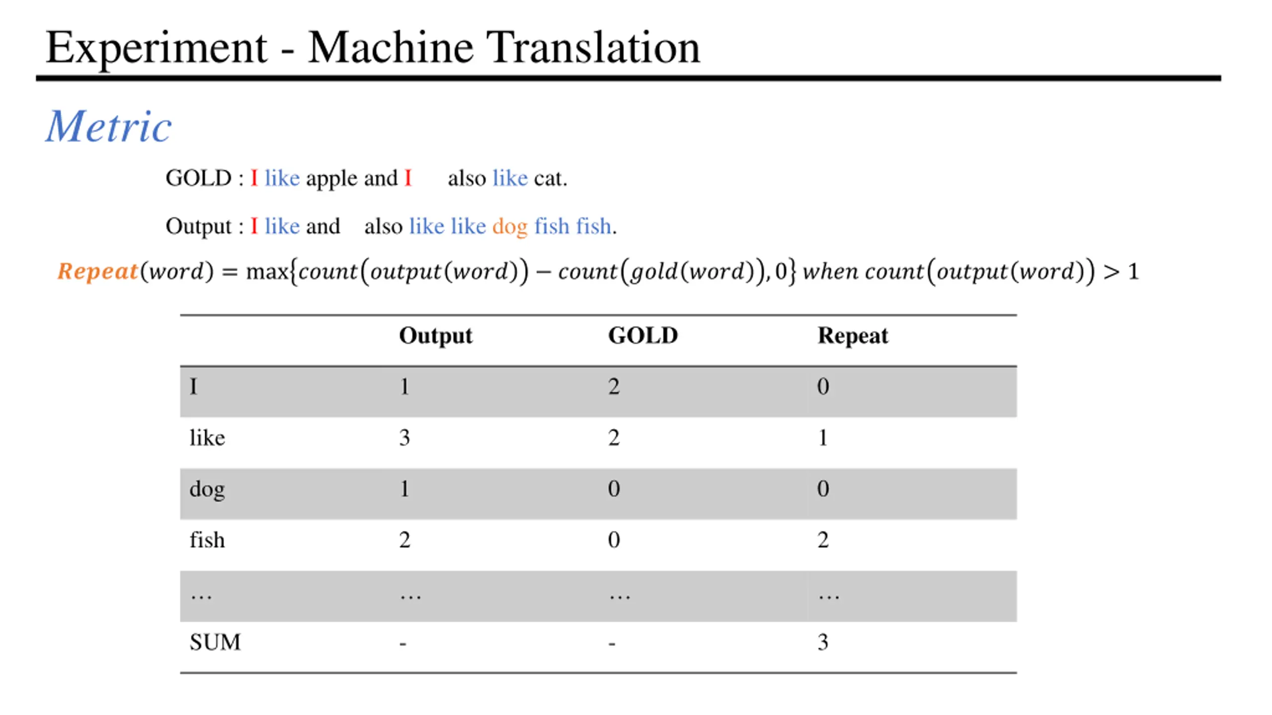 Experiment - Machine Translation Metric GOLD : I like apple and I also like cat. Output : I like and also like like dog fish fish. ?????? ???? = max ????? ?????? ???? ????? ???? ???? ,0 ? ?? ????? ?????? ???? > 1 Output GOLD Repeat I 1 2 0 like 3 2 1 dog 1 0 0 fish 2 0 2 SUM - - 3