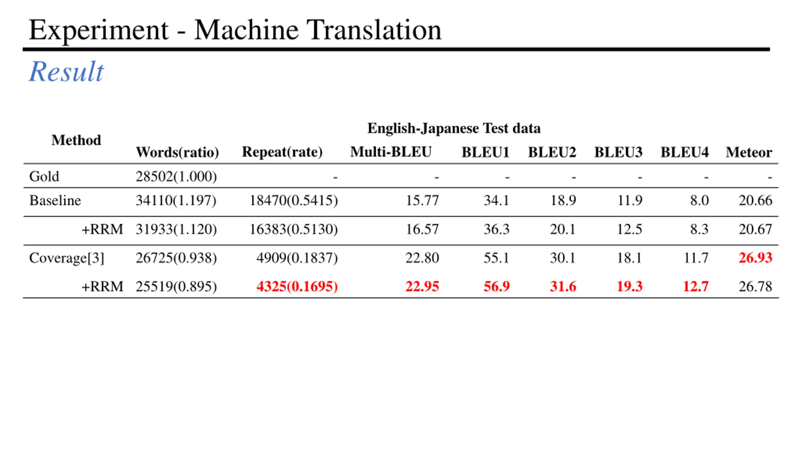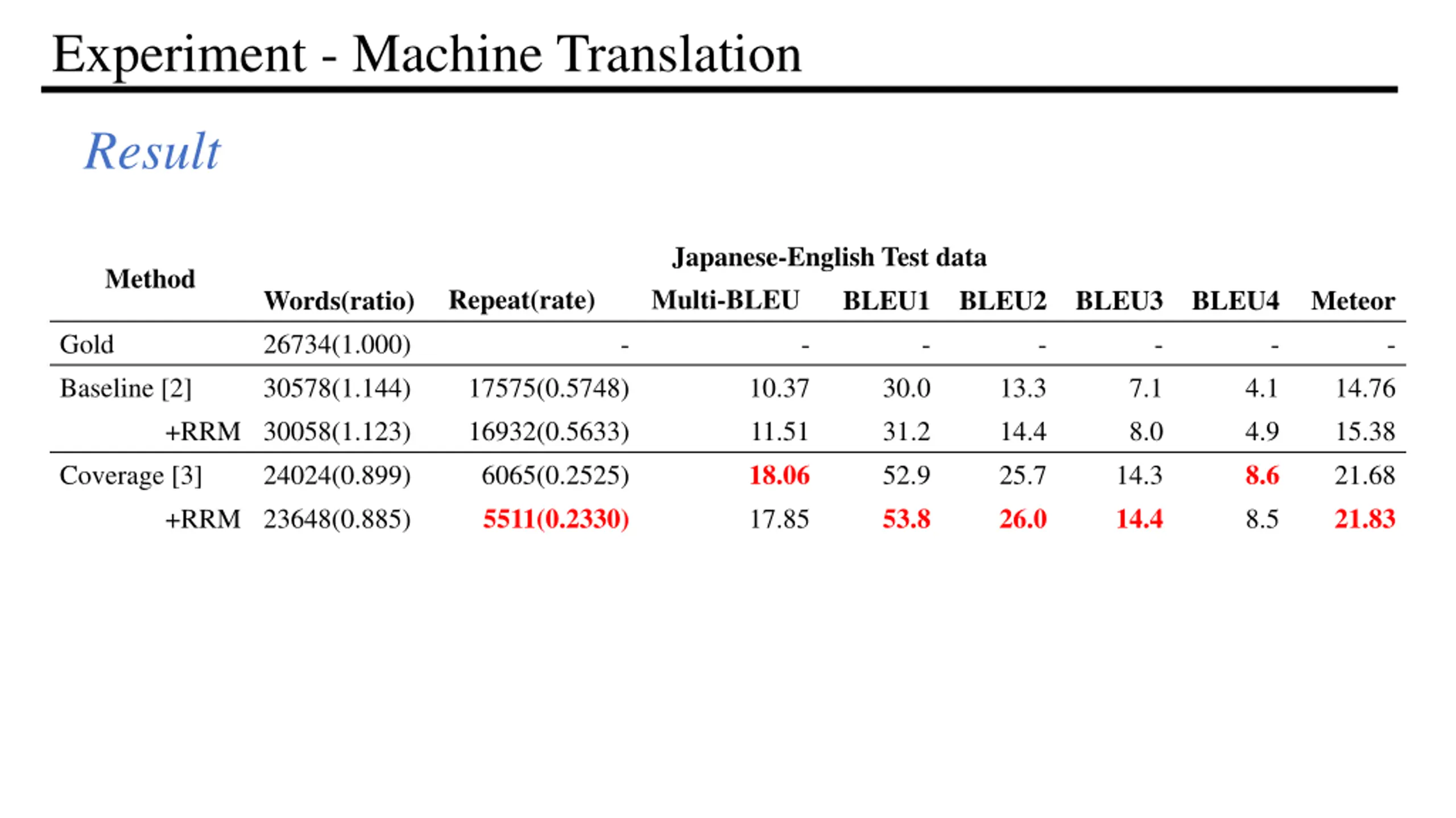 Experiment - Machine Translation Result Japanese-English Test data Multi-BLEU - 10.37 11.51 18.06 17.85 Method Repeat(rate) Words(ratio) 26734(1.000) 30578(1.144) BLEU1 BLEU2 BLEU3 BLEU4 Meteor Gold Baseline [2] - - - - - - 17575(0.5748) 16932(0.5633) 6065(0.2525) 5511(0.2330) 30.0 31.2 52.9 53.8 13.3 14.4 25.7 26.0 7.1 8.0 14.3 14.4 4.1 4.9 8.6 8.5 14.76 15.38 21.68 21.83 +RRM 30058(1.123) Coverage [3] +RRM 23648(0.885) 24024(0.899)
