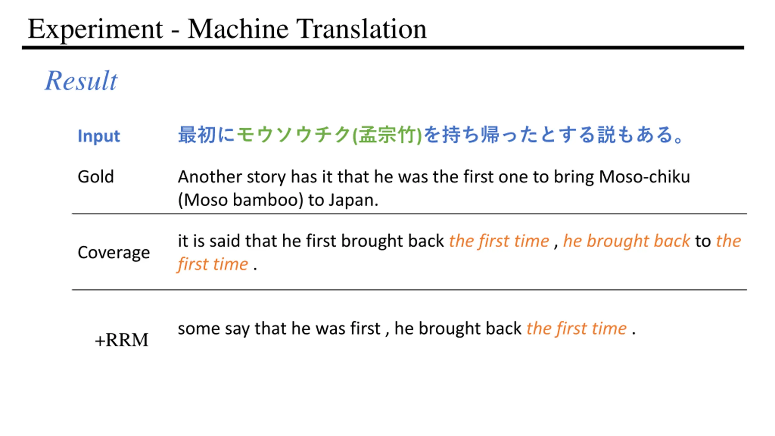 Experiment - Machine Translation Result ( ) Input Gold Another story has it that he was the first one to bring Moso-chiku (Moso bamboo) to Japan. it is said that he first brought back the first time , he brought back to the first time . Coverage some say that he was first , he brought back the first time . +RRM