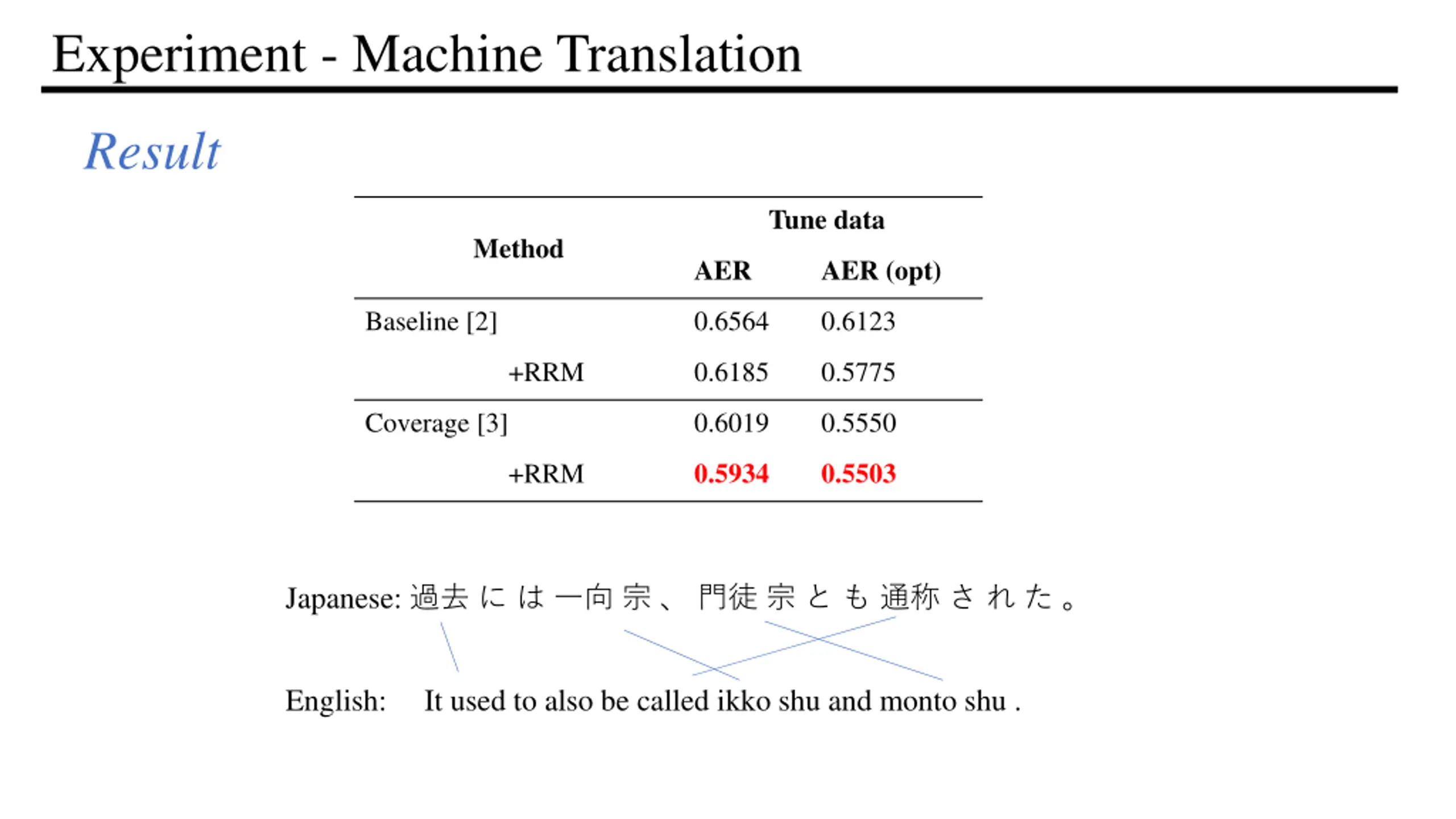 Experiment - Machine Translation Result Tune data Method AER AER (opt) Baseline [2] 0.6564 0.6123 +RRM 0.6185 0.5775 Coverage [3] 0.6019 0.5550 0.5934 0.5503 +RRM Japanese: English: It used to also be called ikko shu and monto shu .