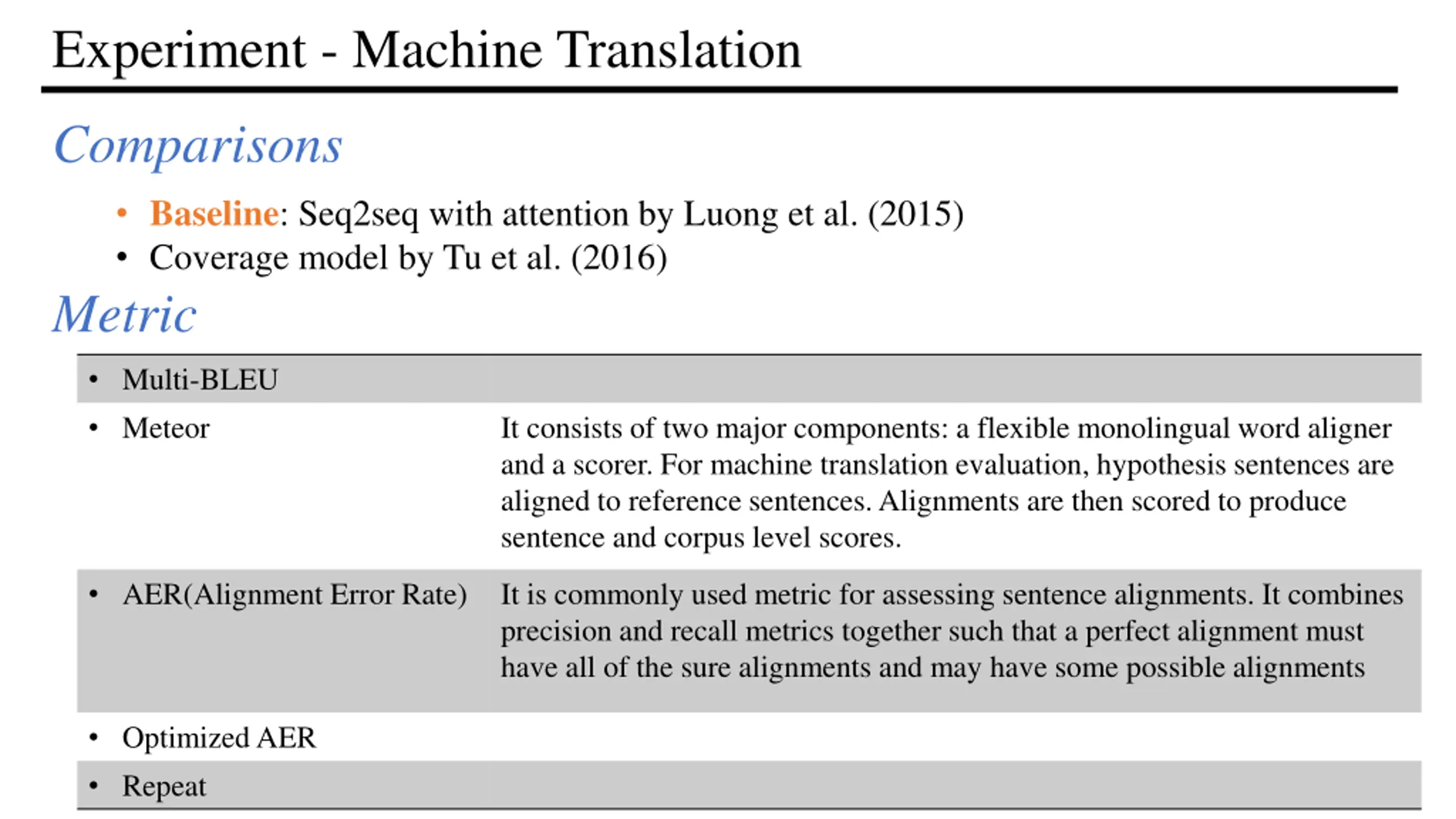 Experiment - Machine Translation Comparisons Baseline: Seq2seq with attention by Luong et al. (2015) Coverage model by Tu et al. (2016) Metric Multi-BLEU Meteor It consists of two major components: a flexible monolingual word aligner and a scorer. For machine translation evaluation, hypothesis sentences are aligned to reference sentences. Alignments are then scored to produce sentence and corpus level scores. AER(Alignment Error Rate) It is commonly used metric for assessing sentence alignments. It combines precision and recall metrics together such that a perfect alignment must have all of the sure alignments and may have some possible alignments Optimized AER Repeat