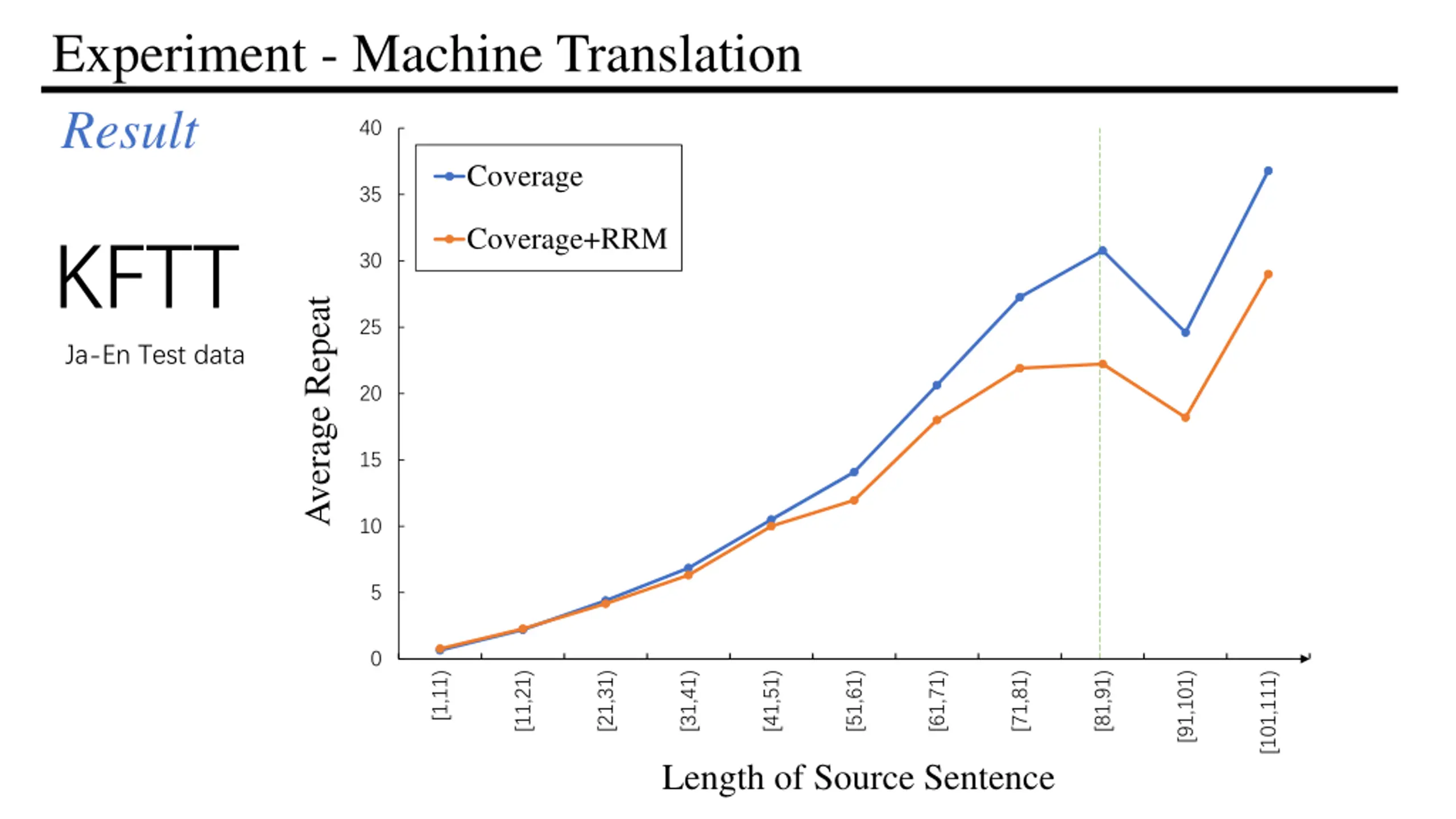Experiment - Machine Translation Result 40 Coverage 35 Coverage+RRM KFTT 30 Average Repeat 25 Ja-En Test data 20 15 10 5 0 [1,11) [21,31) [71,81) [91,101) [11,21) [31,41) [41,51) [51,61) [61,71) [81,91) [101,111) Length of Source Sentence