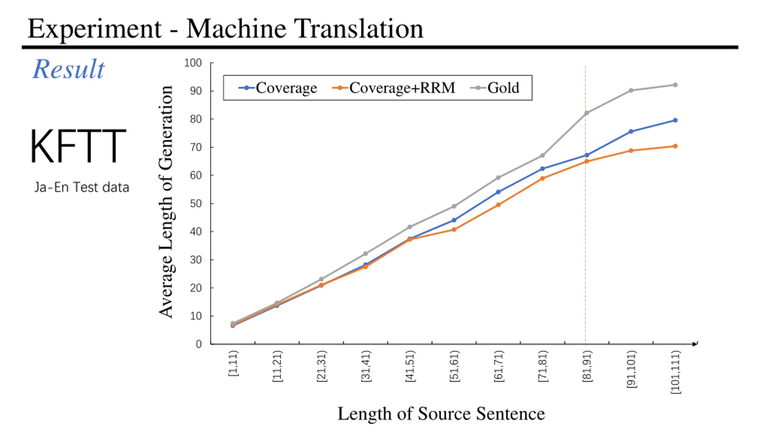 Experiment - Machine Translation Result 100 Coverage Coverage+RRM Gold 90 Average Length of Generation 80 KFTT 70 60 Ja-En Test data 50 40 30 20 10 0 [1,11) [11,21) [21,31) [31,41) [41,51) [51,61) [61,71) [71,81) [81,91) [91,101) [101,111) Length of Source Sentence
