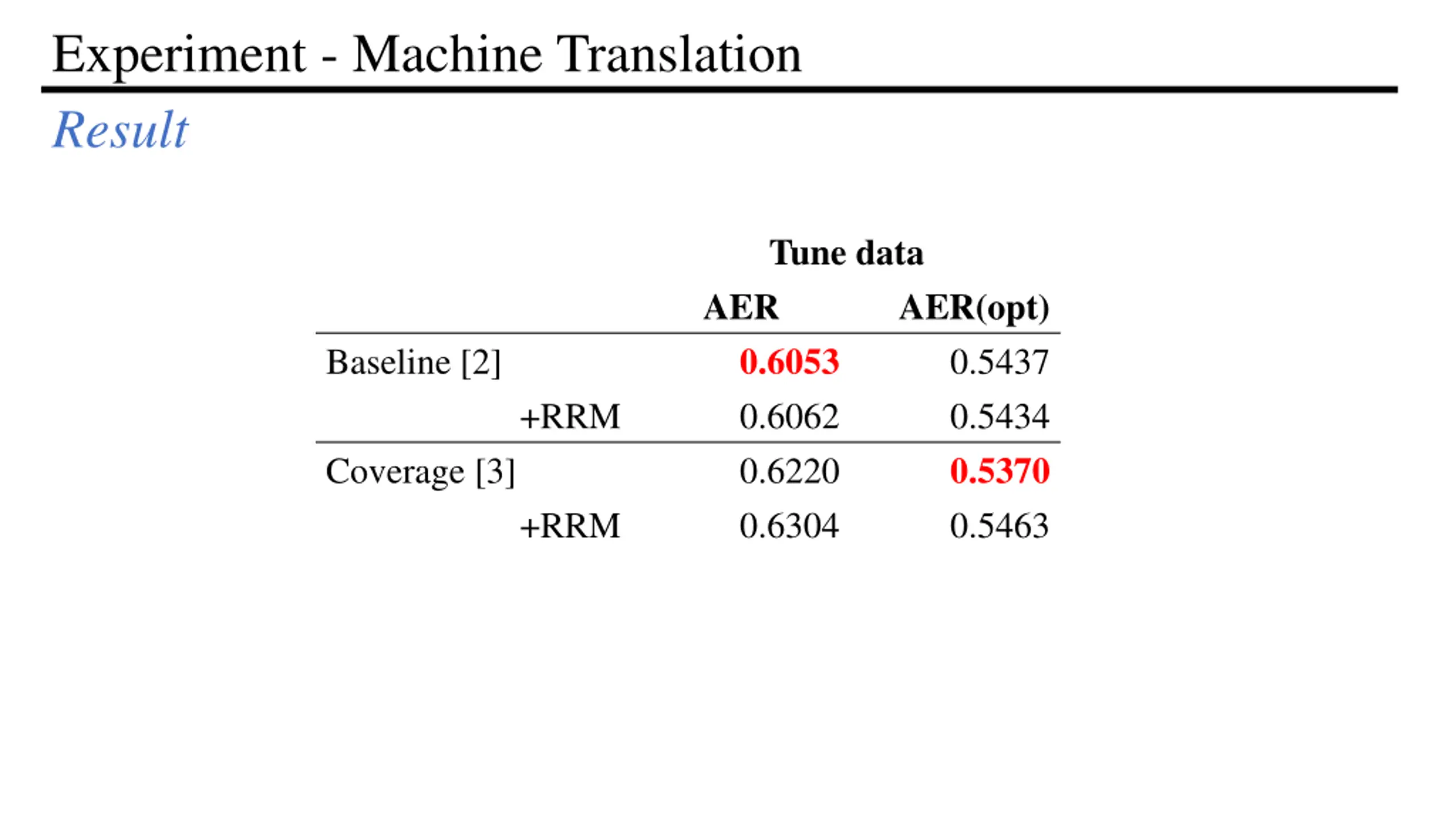 Experiment - Machine Translation Result Tune data AER 0.6053 0.6062 0.6220 0.6304 AER(opt) 0.5437 0.5434 0.5370 0.5463 Baseline [2] +RRM Coverage [3] +RRM