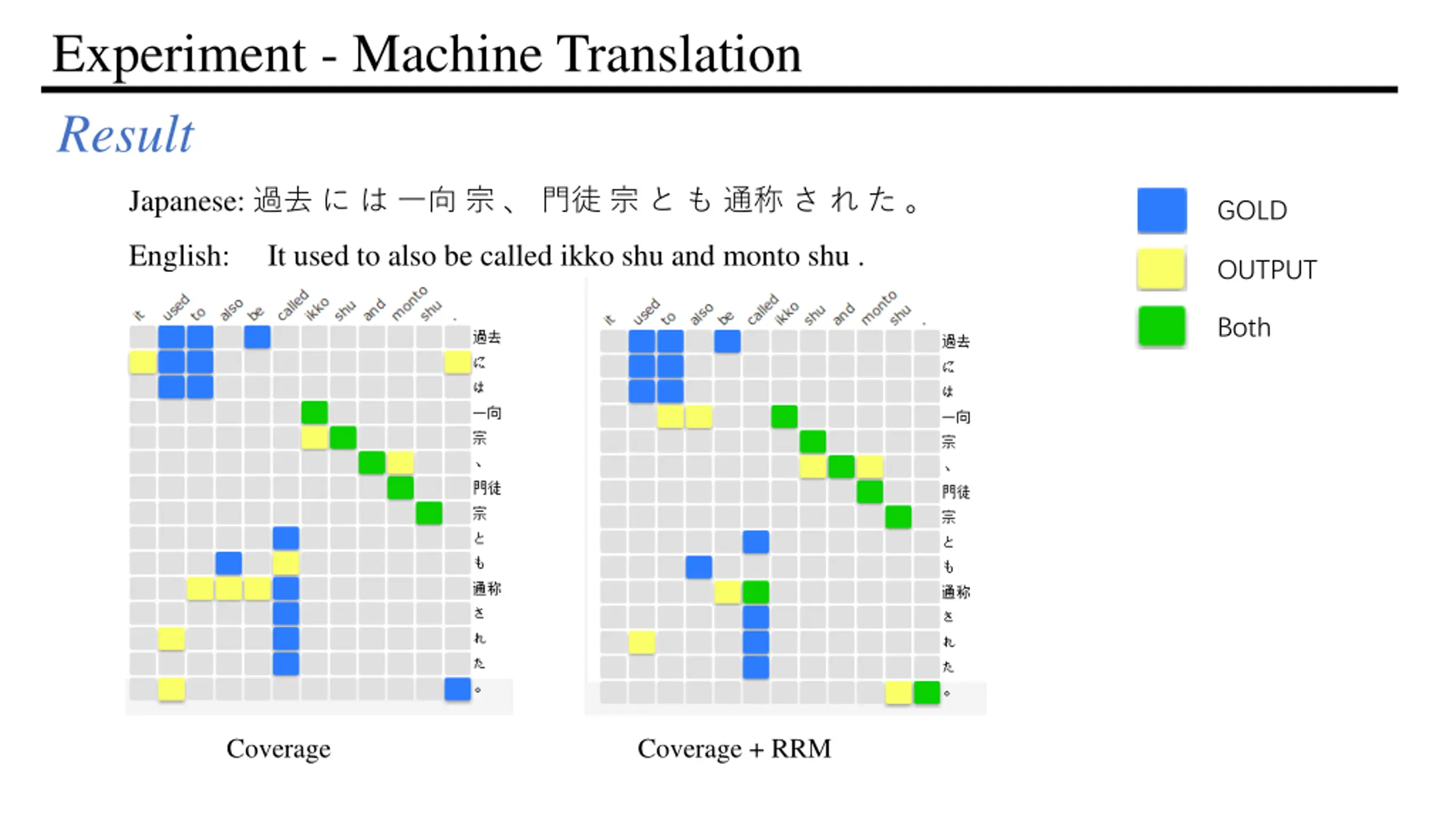 Experiment - Machine Translation Result Japanese: GOLD English: It used to also be called ikko shu and monto shu . OUTPUT Both Coverage Coverage + RRM