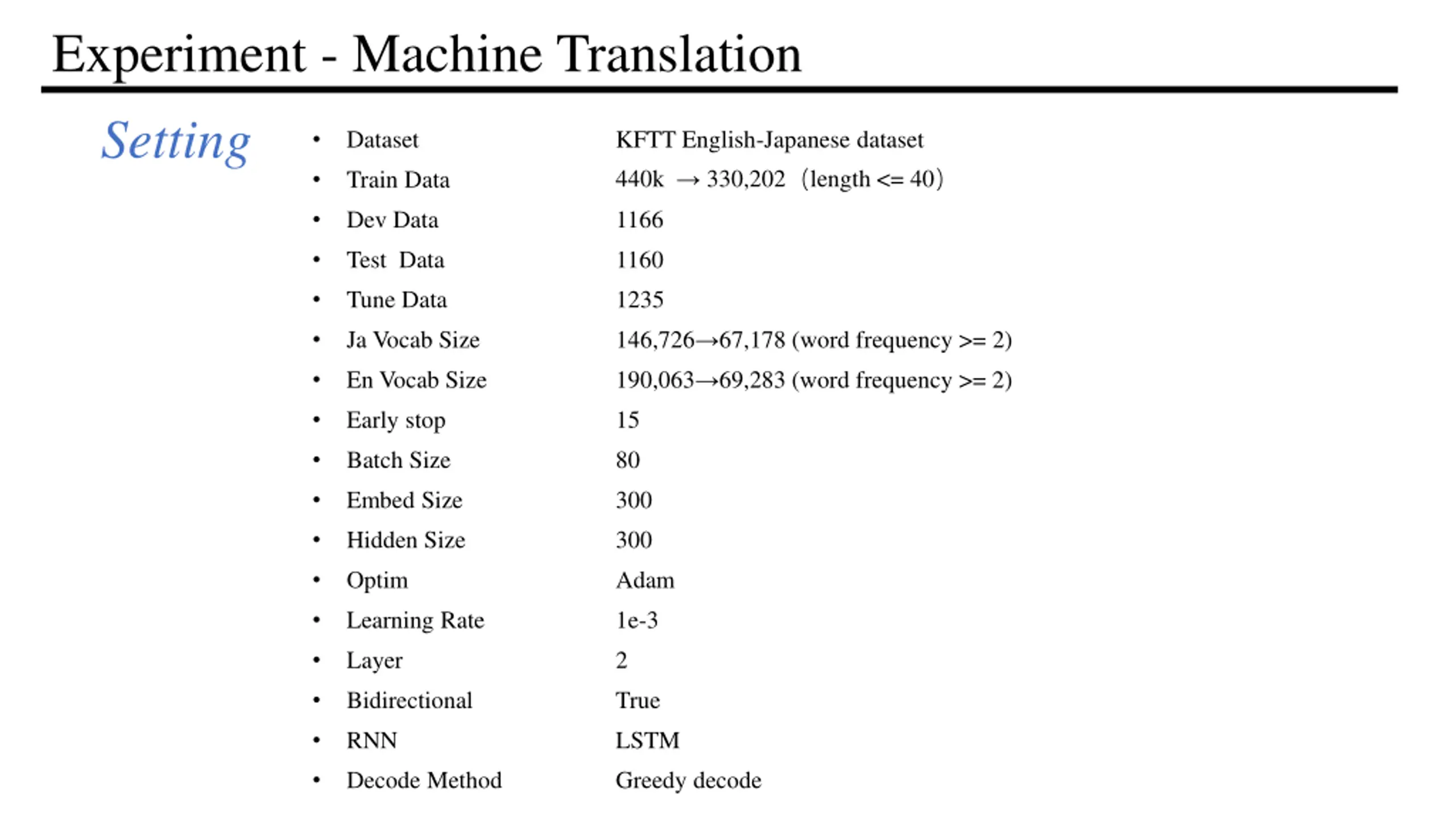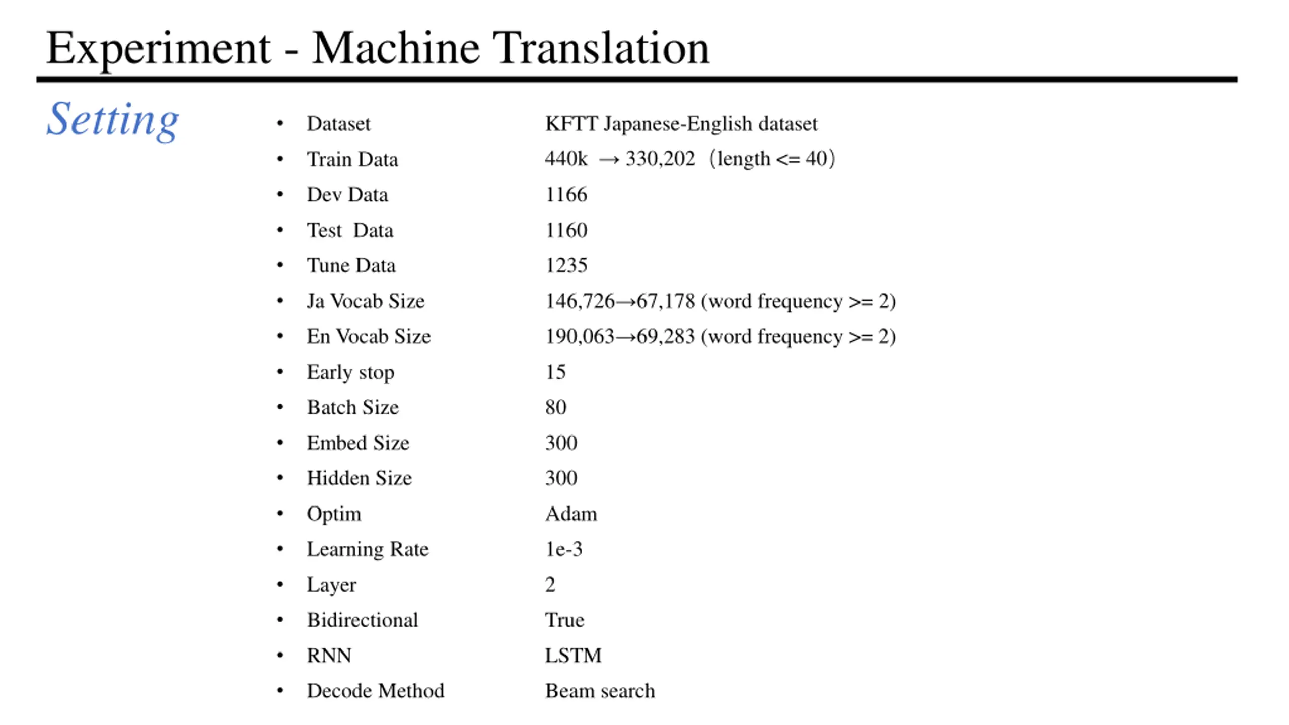Experiment - Machine Translation Setting Train Data Dataset KFTT English-Japanese dataset 440k 330,202 length <= 40 Dev Data 1166 Test Data 1160 Tune Data 1235 Ja Vocab Size 146,726 67,178 (word frequency >= 2) En Vocab Size 190,063 69,283 (word frequency >= 2) Early stop 15 Batch Size 80 Embed Size 300 Hidden Size 300 Optim Adam Learning Rate 1e-3 Layer 2 Bidirectional True RNN LSTM Decode Method Greedy decode