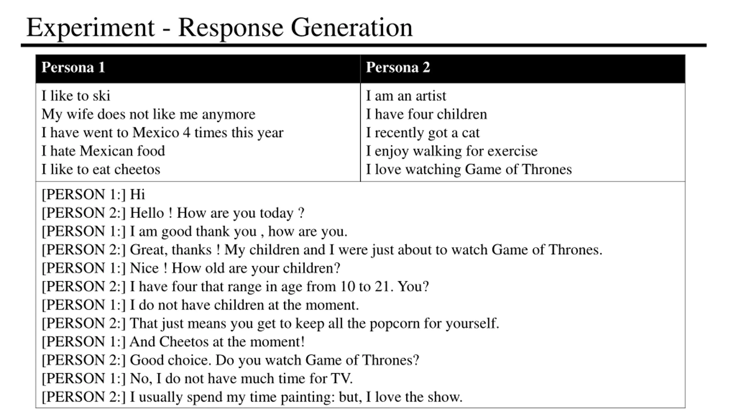 Experiment - Response Generation Persona 1 Persona 2 I like to ski My wife does not like me anymore I have went to Mexico 4 times this year I hate Mexican food I like to eat cheetos I am an artist I have four children I recently got a cat I enjoy walking for exercise I love watching Game of Thrones [PERSON 1:] Hi [PERSON 2:] Hello ! How are you today ? [PERSON 1:] I am good thank you , how are you. [PERSON 2:] Great, thanks ! My children and I were just about to watch Game of Thrones. [PERSON 1:] Nice ! How old are your children? [PERSON 2:] I have four that range in age from 10 to 21. You? [PERSON 1:] I do not have children at the moment. [PERSON 2:] That just means you get to keep all the popcorn for yourself. [PERSON 1:] And Cheetos at the moment! [PERSON 2:] Good choice. Do you watch Game of Thrones? [PERSON 1:] No, I do not have much time for TV. [PERSON 2:] I usually spend my time painting: but, I love the show.
