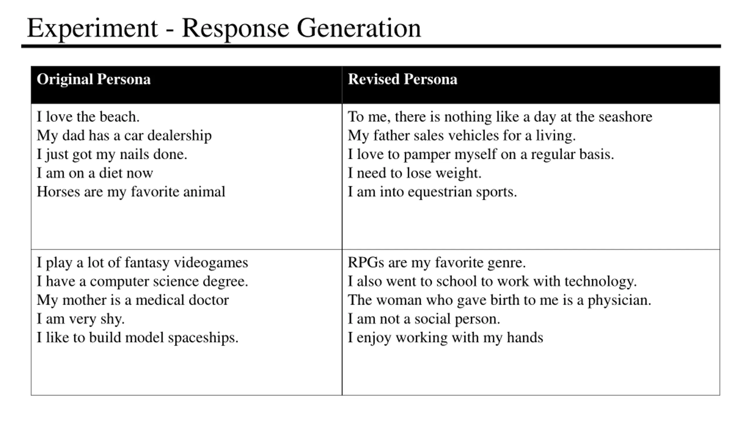 Experiment - Response Generation Original Persona Revised Persona I love the beach. My dad has a car dealership I just got my nails done. I am on a diet now Horses are my favorite animal To me, there is nothing like a day at the seashore My father sales vehicles for a living. I love to pamper myself on a regular basis. I need to lose weight. I am into equestrian sports. I play a lot of fantasy videogames I have a computer science degree. My mother is a medical doctor I am very shy. I like to build model spaceships. RPGs are my favorite genre. I also went to school to work with technology. The woman who gave birth to me is a physician. I am not a social person. I enjoy working with my hands