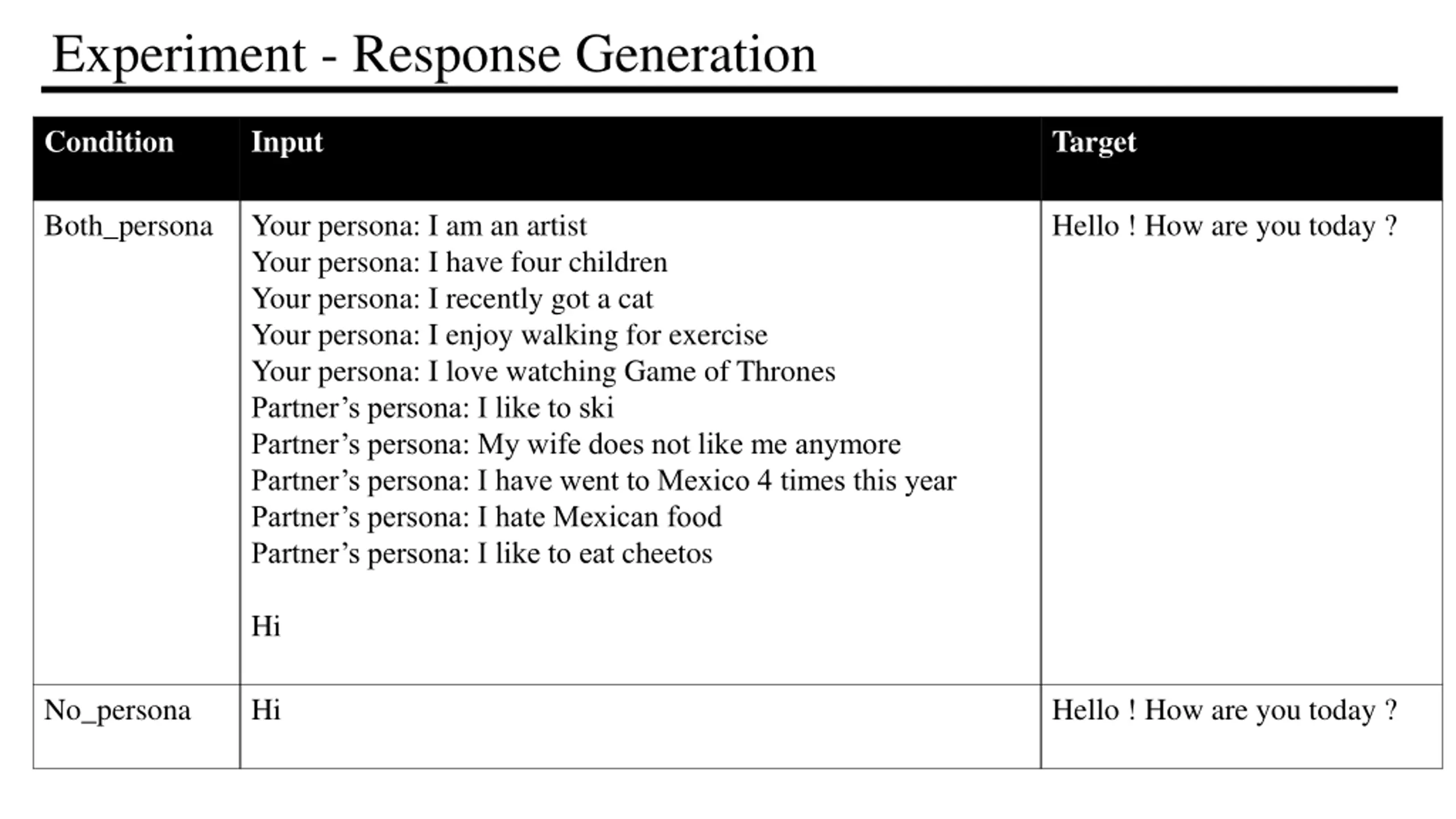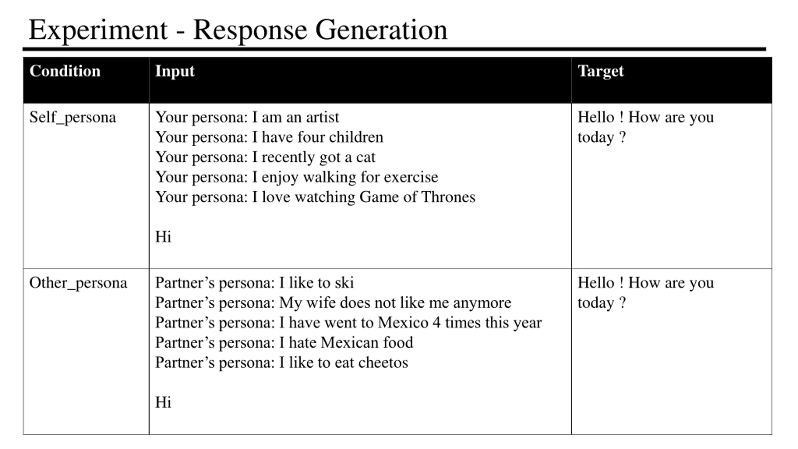 Experiment - Response Generation Condition Input Target : Self_persona Your persona: I am an artist Your persona: I have four children Your persona: I recently got a cat Your persona: I enjoy walking for exercise Your persona: I love watching Game of Thrones Hello ! How are you today ? Hi Other_persona Hello ! How are you today ? Partner s persona: I like to ski Partner s persona: My wife does not like me anymore Partner s persona: I have went to Mexico 4 times this year Partner s persona: I hate Mexican food Partner s persona: I like to eat cheetos Hi