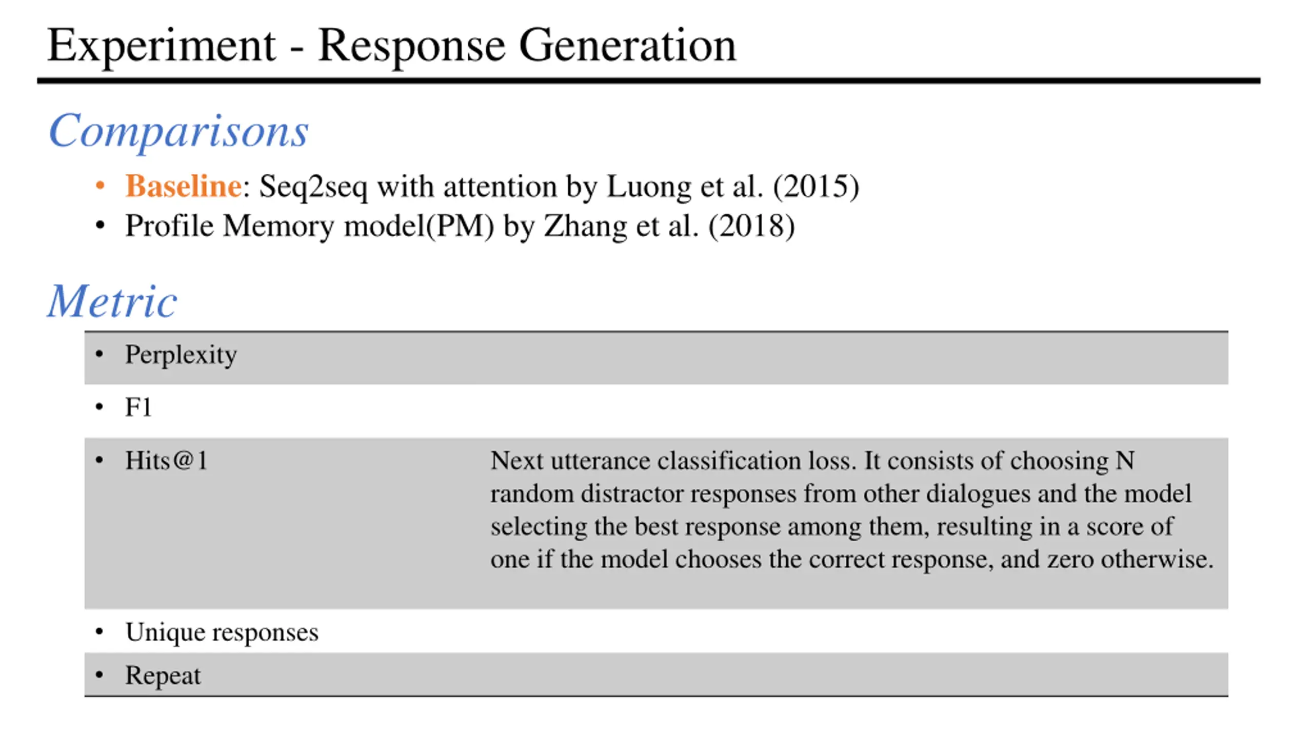 Experiment - Response Generation Comparisons Baseline: Seq2seq with attention by Luong et al. (2015) Profile Memory model(PM) by Zhang et al. (2018) Metric Perplexity F1 Hits@1 Next utterance classification loss. It consists of choosing N random distractor responses from other dialogues and the model selecting the best response among them, resulting in a score of one if the model chooses the correct response, and zero otherwise. Unique responses Repeat