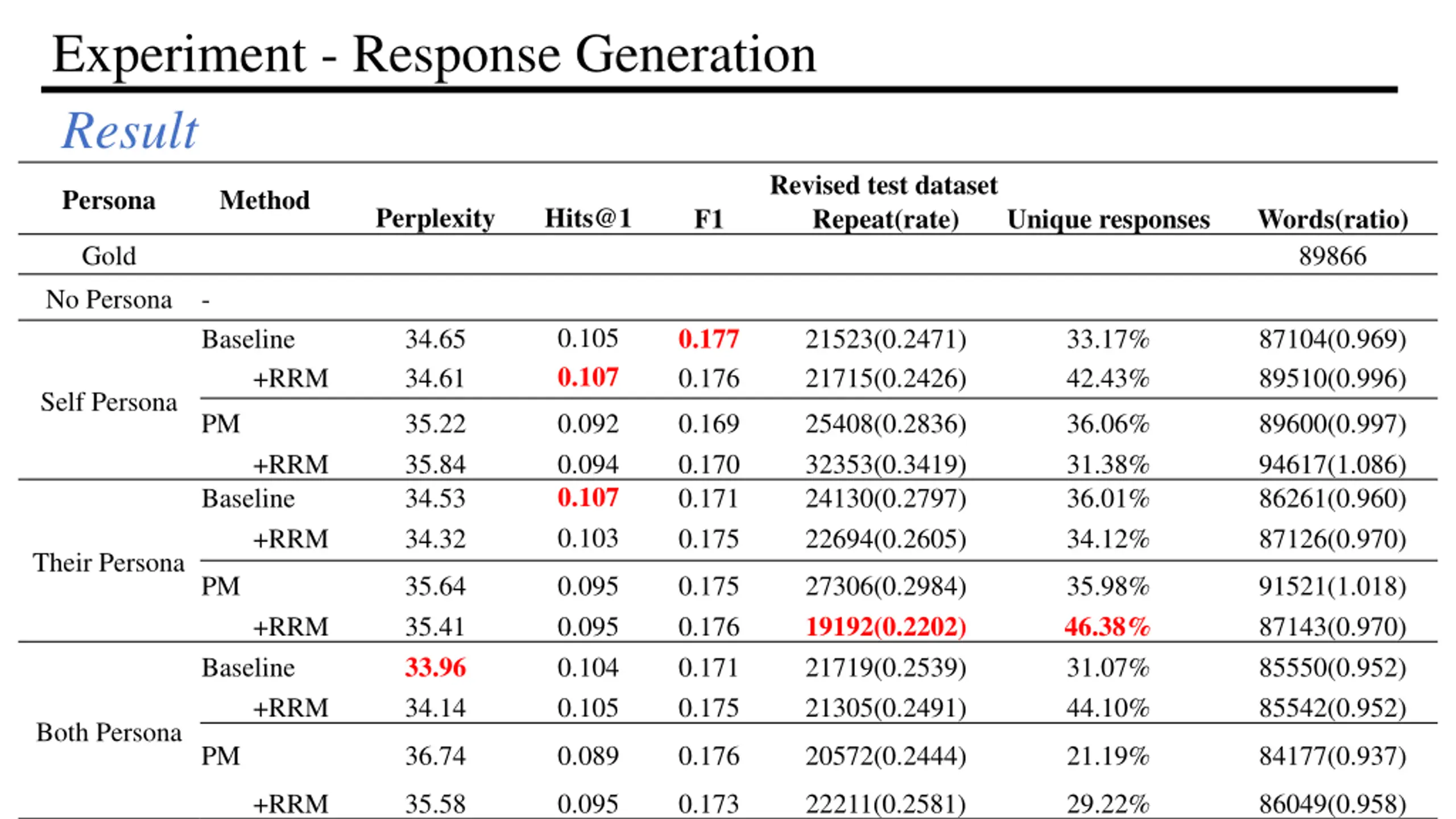 Experiment - Response Generation Result Revised test dataset Repeat(rate) Persona Method Perplexity Hits@1 F1 Unique responses Words(ratio) 89866 Gold No Persona - Baseline 0.105 0.107 0.177 0.176 34.65 34.61 21523(0.2471) 21715(0.2426) 33.17% 42.43% 87104(0.969) 89510(0.996) +RRM Self Persona PM 35.22 35.84 34.53 34.32 0.092 0.094 0.107 0.103 0.169 0.170 0.171 0.175 25408(0.2836) 32353(0.3419) 24130(0.2797) 22694(0.2605) 36.06% 31.38% 36.01% 34.12% 89600(0.997) 94617(1.086) 86261(0.960) 87126(0.970) +RRM Baseline +RRM Their Persona PM 35.64 35.41 33.96 34.14 0.095 0.095 0.104 0.105 0.175 0.176 0.171 0.175 27306(0.2984) 19192(0.2202) 21719(0.2539) 21305(0.2491) 35.98% 46.38% 31.07% 44.10% 91521(1.018) 87143(0.970) 85550(0.952) 85542(0.952) +RRM Baseline +RRM Both Persona PM 36.74 0.089 0.176 20572(0.2444) 21.19% 84177(0.937) +RRM 35.58 0.095 0.173 22211(0.2581) 29.22% 86049(0.958)