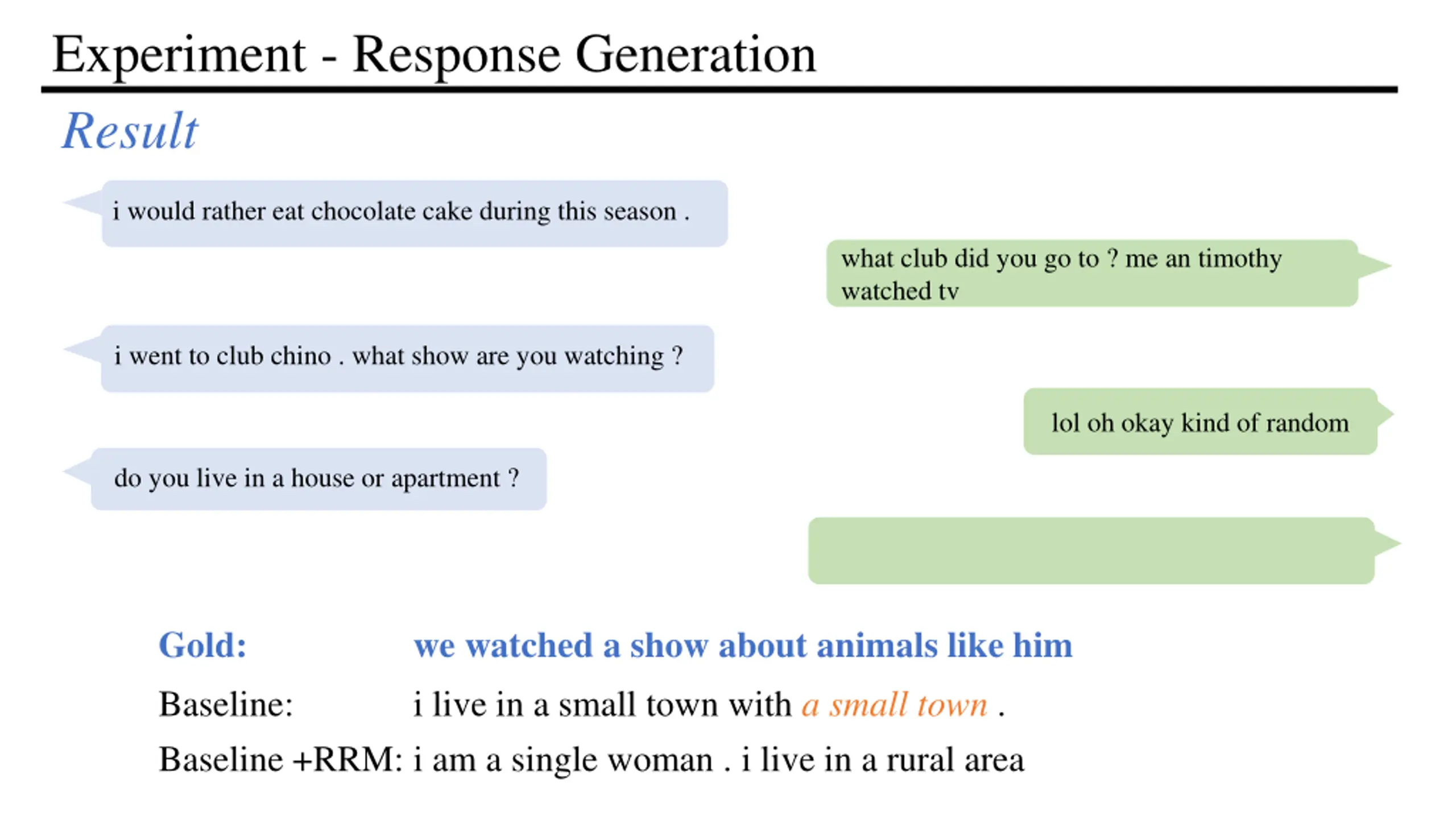 Experiment - Response Generation Result i would rather eat chocolate cake during this season . what club did you go to ? me an timothy watched tv i went to club chino . what show are you watching ? lol oh okay kind of random do you live in a house or apartment ? Gold: we watched a show about animals like him Baseline: i live in a small town with a small town . Baseline +RRM: i am a single woman . i live in a rural area