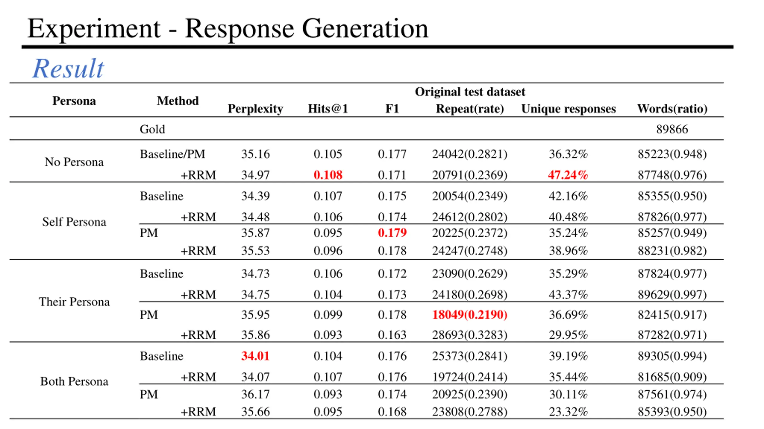 Experiment - Response Generation Result Original test dataset Repeat(rate) Persona Method Perplexity Hits@1 F1 Unique responses Words(ratio) 89866 Gold Baseline/PM 35.16 0.105 0.108 0.177 24042(0.2821) 36.32% 47.24% 85223(0.948) No Persona +RRM 34.97 0.171 20791(0.2369) 87748(0.976) Baseline 34.39 0.107 0.175 20054(0.2349) 42.16% 85355(0.950) +RRM 34.48 35.87 35.53 0.106 0.095 0.096 0.174 0.179 0.178 24612(0.2802) 20225(0.2372) 24247(0.2748) 40.48% 35.24% 38.96% 87826(0.977) 85257(0.949) 88231(0.982) Self Persona PM +RRM Baseline 34.73 0.106 0.172 23090(0.2629) 35.29% 87824(0.977) +RRM 34.75 35.95 35.86 34.01 0.104 0.099 0.093 0.173 0.178 0.163 24180(0.2698) 18049(0.2190) 28693(0.3283) 43.37% 36.69% 29.95% 89629(0.997) 82415(0.917) 87282(0.971) Their Persona PM +RRM Baseline 0.104 0.176 25373(0.2841) 39.19% 89305(0.994) +RRM 34.07 36.17 35.66 0.107 0.093 0.095 0.176 0.174 0.168 19724(0.2414) 20925(0.2390) 23808(0.2788) 35.44% 30.11% 23.32% 81685(0.909) 87561(0.974) 85393(0.950) Both Persona PM +RRM