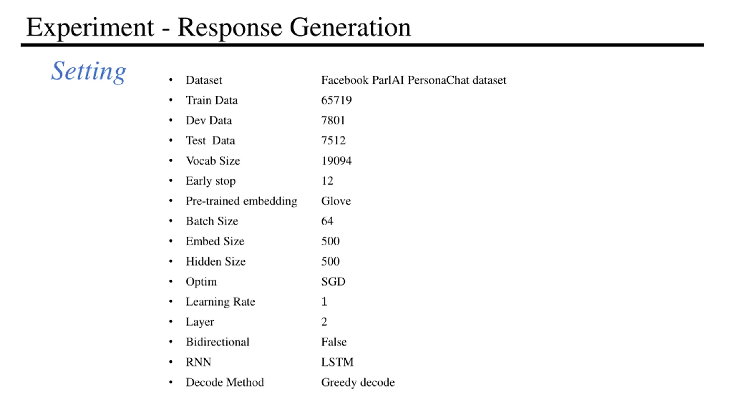 Experiment - Response Generation Setting Dataset Facebook ParlAI PersonaChat dataset Train Data 65719 Dev Data 7801 Test Data 7512 Vocab Size 19094 Early stop 12 Pre-trained embedding Glove Batch Size 64 Embed Size 500 Hidden Size 500 Optim SGD Learning Rate 1 Layer 2 Bidirectional False RNN LSTM Decode Method Greedy decode