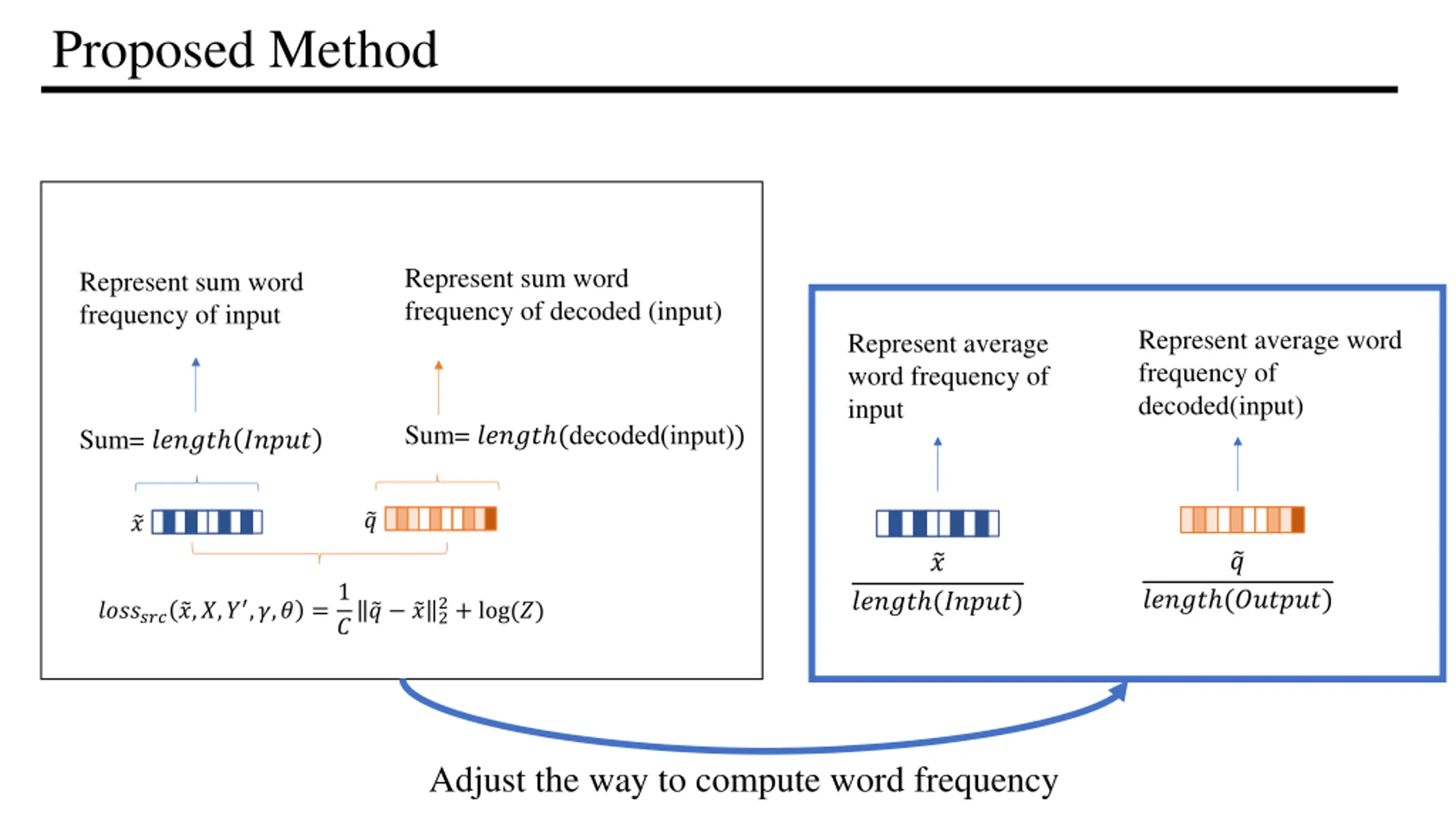 Proposed Method Represent sum word frequency of decoded (input) Represent sum word frequency of input Represent average word frequency of decoded(input) Represent average word frequency of input Sum= ????? (decoded(input)) Sum= ????? ????? ? ? ? ? ??????? ?,?,? ,?,? =1 ????? (??????) ????? (?????) 2+ log(?) ? ?2 ? Adjust the way to compute word frequency