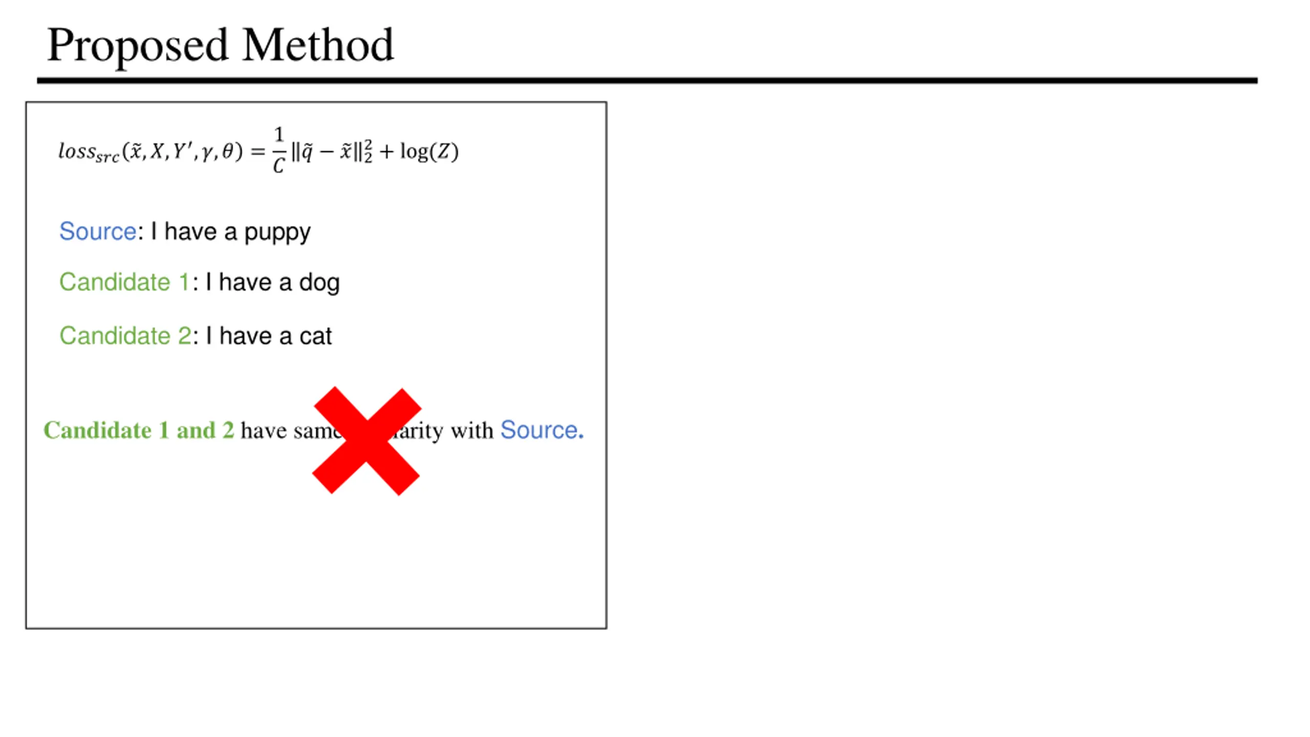 Proposed Method ??????? ?,?,? ,?,? =1 2+ log(?) ? ?2 ? Source: I have a puppy Candidate 1: I have a dog Candidate 2: I have a cat Candidate 1 and 2 have same similarity with Source.