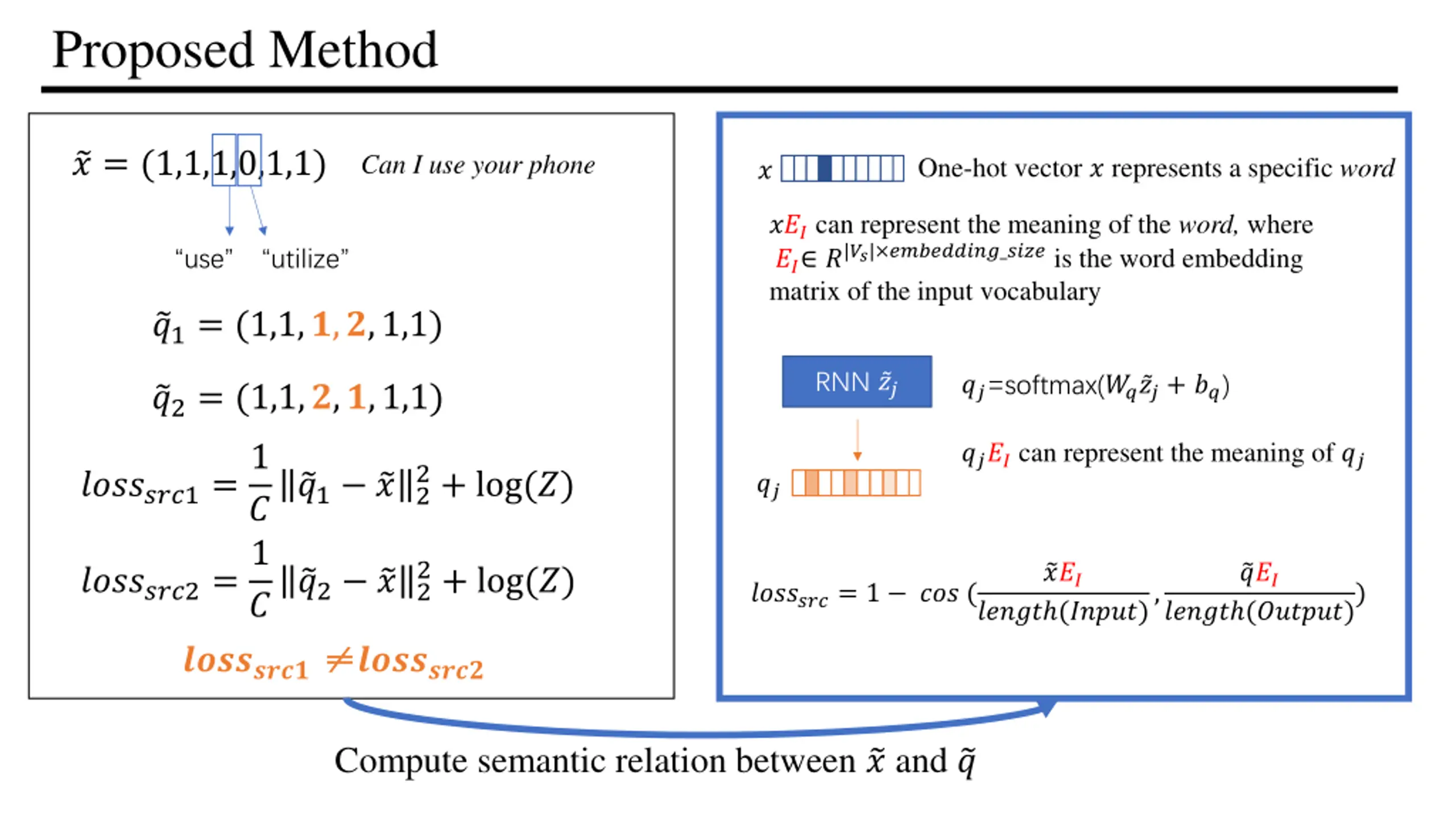 Proposed Method ? = (1,1,1,0,1,1) Can I use your phone One-hot vector ? represents a specific word ? ???can represent the meaning of the word, where ?? ?|??| ?????????_????is the word embedding matrix of the input vocabulary use utilize ?1= (1,1,?,?,1,1) RNN ?? ??=softmax(?? ??+ ??) ?2= (1,1,?,?,1,1) ???????1=1 ? ???????2=1 ? ???????? ????can represent the meaning of ?? 2+ log(?) ?1 ?2 ?? 2+ log(?) ??? ??? ?2 ?2 ???????= 1 ??? ( ????? (?????), ????? (??????)) ???????? Compute semantic relation between ? and ?