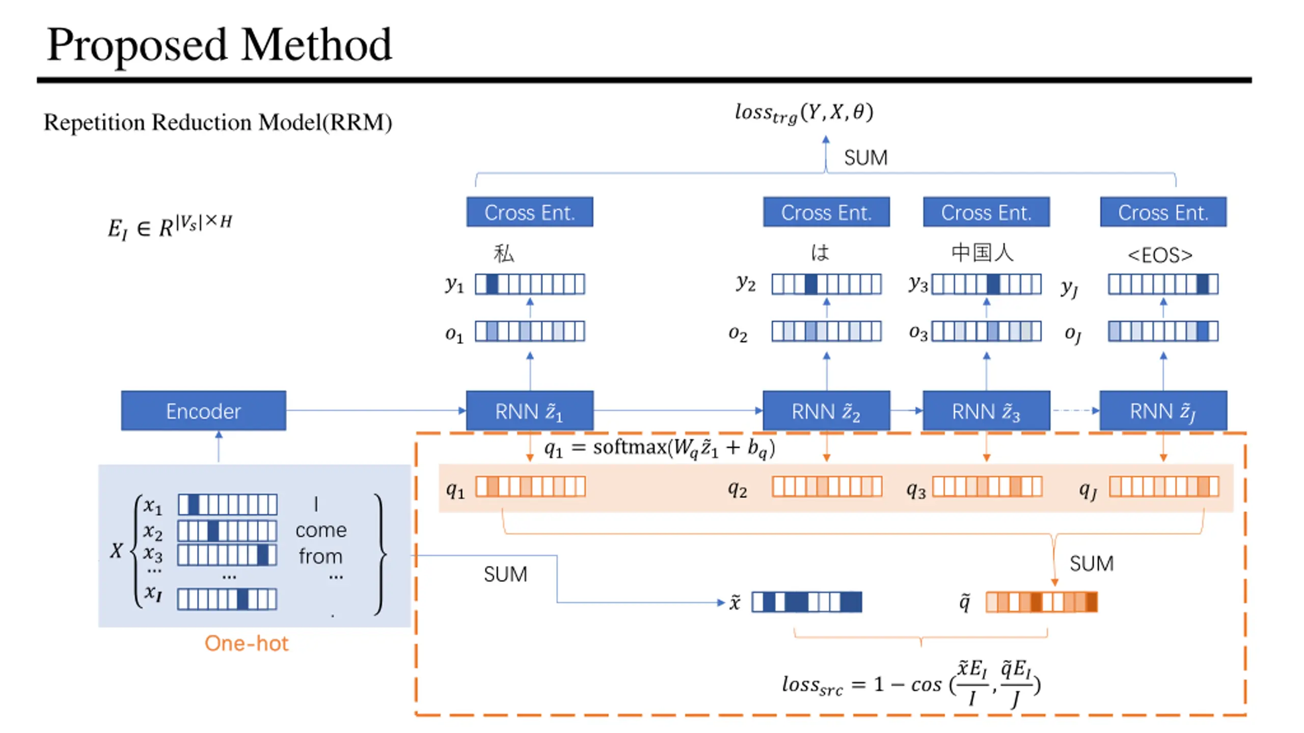 Proposed Method ????????,?,? Repetition Reduction Model(RRM) SUM Cross Ent. Cross Ent. Cross Ent. Cross Ent. ?? ?|??| ? <EOS> ?2 ?3 ?1 ?? ?3 ?2 ?? ?1 RNN ?? Encoder RNN ?1 RNN ?2 RNN ?3 ?1= softmax(?? ?1+ ??) ?2 ?1 ?3 ?? I ?1 ?2 ?3 ?? I ?1 ?2 ?3 ?? am come from Chinese <EOS> . ? SUM SUM ? ? One One- -hot hot ???????= 1 ??? ( ??? , ??? ?) ?