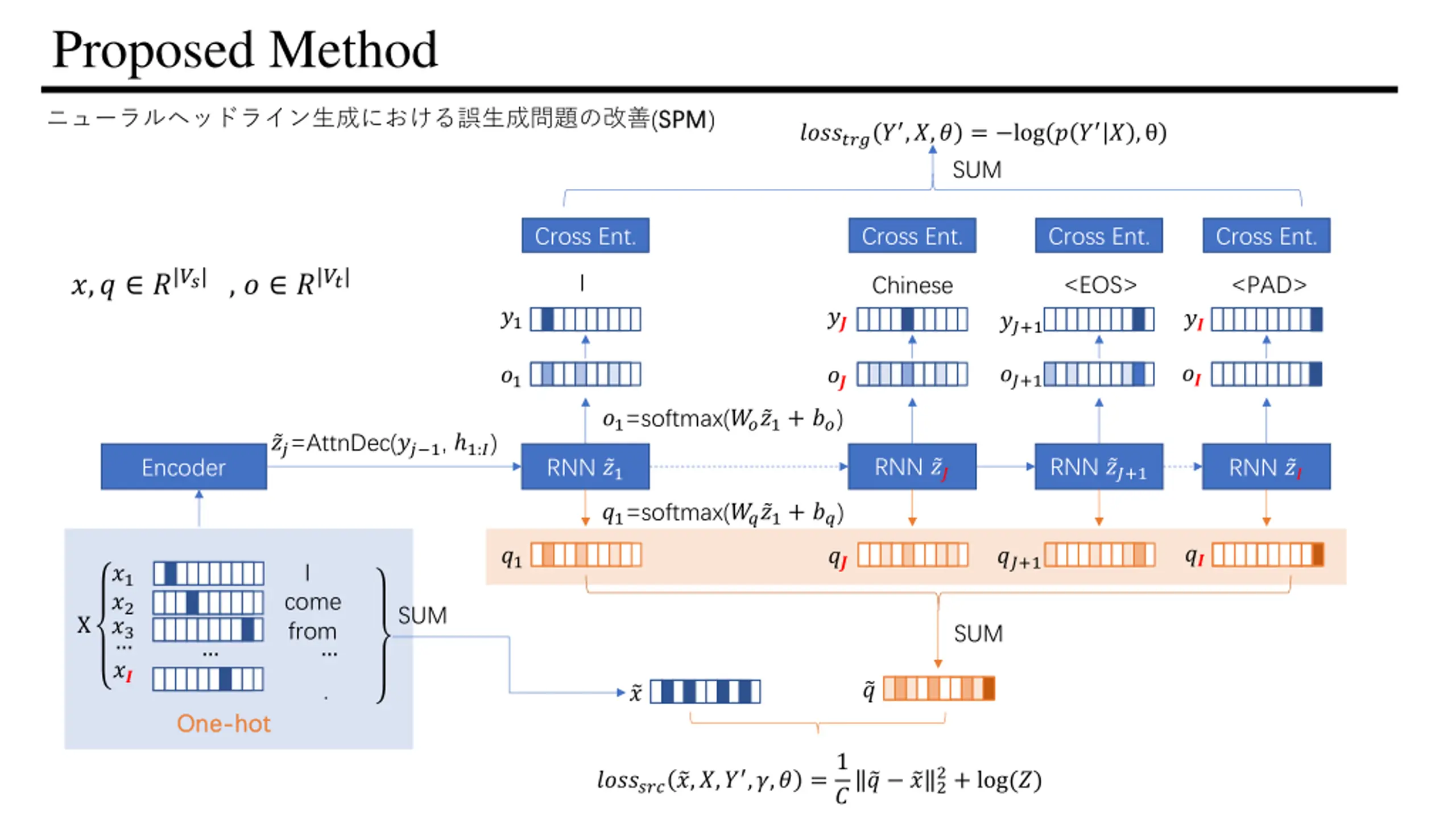 Proposed Method (SPM SPM) ???????? ,?,? = log ? ? ? , SUM Cross Ent. Cross Ent. Cross Ent. Cross Ent. ?,? ?|??|, ? ?|??| I <EOS> <PAD> Chinese ?1 ?? ?? ??+1 ?? ??+1 ?1 ?? ?1=softmax(?? ?1+ ??) ??=AttnDec(?? 1, 1:?) RNN ?? RNN ??+1 Encoder RNN ?1 RNN ?? ?1=softmax(?? ?1+ ??) ?? ?1 ?? ??+1 I ?1 ?2 ?3 ?? come from SUM SUM . ? ? One One- -hot hot ??????? ?,?,? ,?,? =1 2+ log(?) ? ?2 ?
