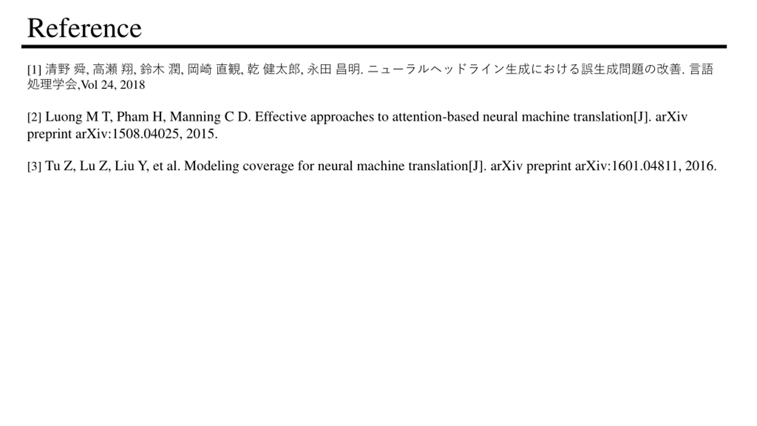 Reference [1] , , , , , . . ,Vol 24, 2018 [2] Luong M T, Pham H, Manning C D. Effective approaches to attention-based neural machine translation[J]. arXiv preprint arXiv:1508.04025, 2015. [3] Tu Z, Lu Z, Liu Y, et al. Modeling coverage for neural machine translation[J]. arXiv preprint arXiv:1601.04811, 2016.