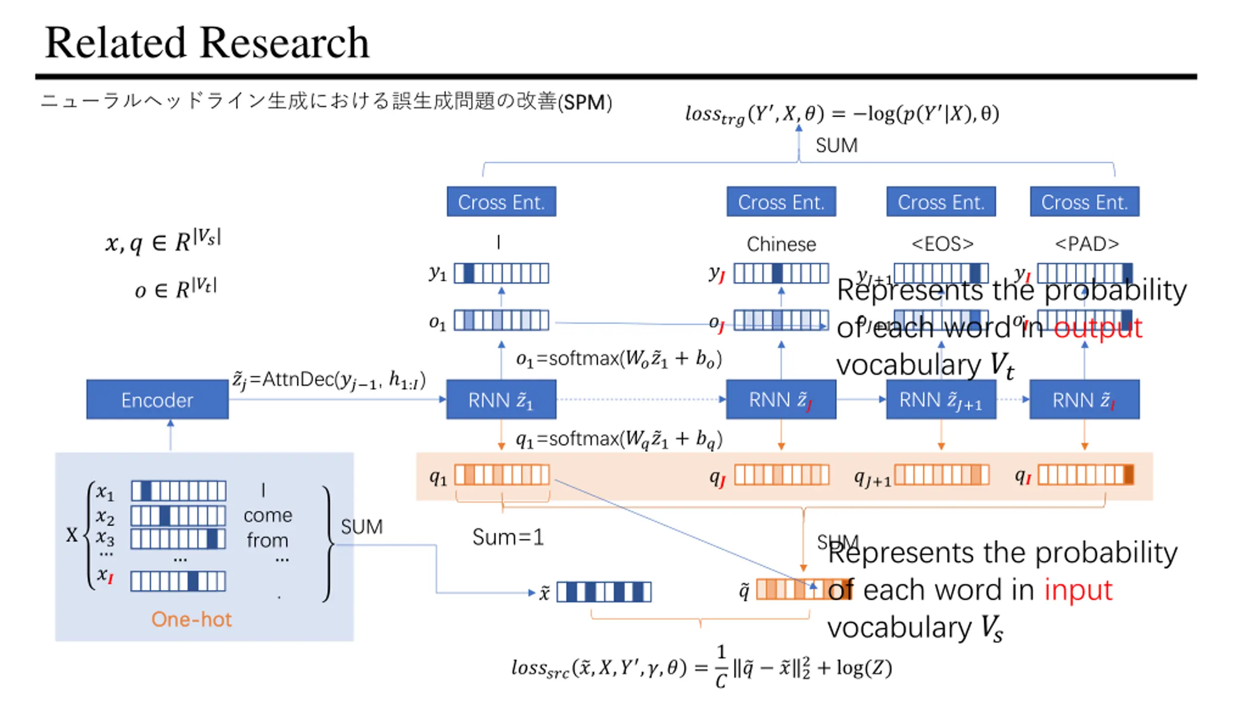 Related Research (SPM SPM) ???????? ,?,? = log ? ? ? , SUM Cross Ent. Cross Ent. Cross Ent. Cross Ent. ?,? ?|??| I <EOS> <PAD> Chinese ?1 ?? ?? ??+1 Represents the probability of each word in output vocabulary ?? ? ?|??| ?? ??+1 ?1 ?? ?1=softmax(?? ?1+ ??) ??=AttnDec(?? 1, 1:?) RNN ?? RNN ??+1 Encoder RNN ?1 RNN ?? ?1=softmax(?? ?1+ ??) ?? ?1 ?? ??+1 I ?1 ?2 ?3 ?? come from SUM Sum=1 SUM Represents the probability of each word in input vocabulary ?? . ? ? One One- -hot hot ??????? ?,?,? ,?,? =1 2+ log(?) ? ?2 ?