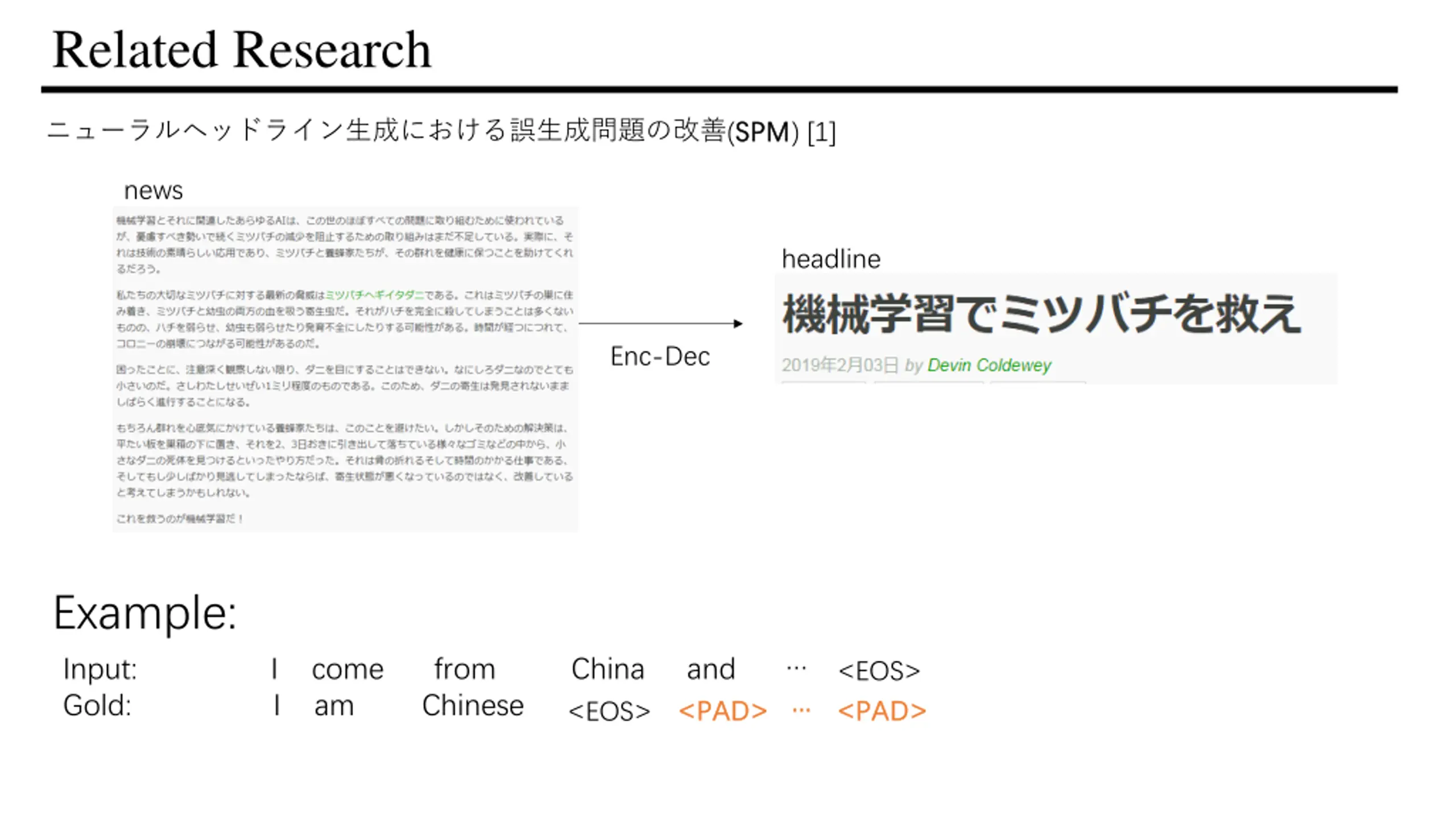 Related Research (SPM SPM) [1] news headline Enc-Dec Example: Input: I come from China and Gold: I am Chinese <EOS> <PAD> <PAD> <PAD> <PAD> <EOS>