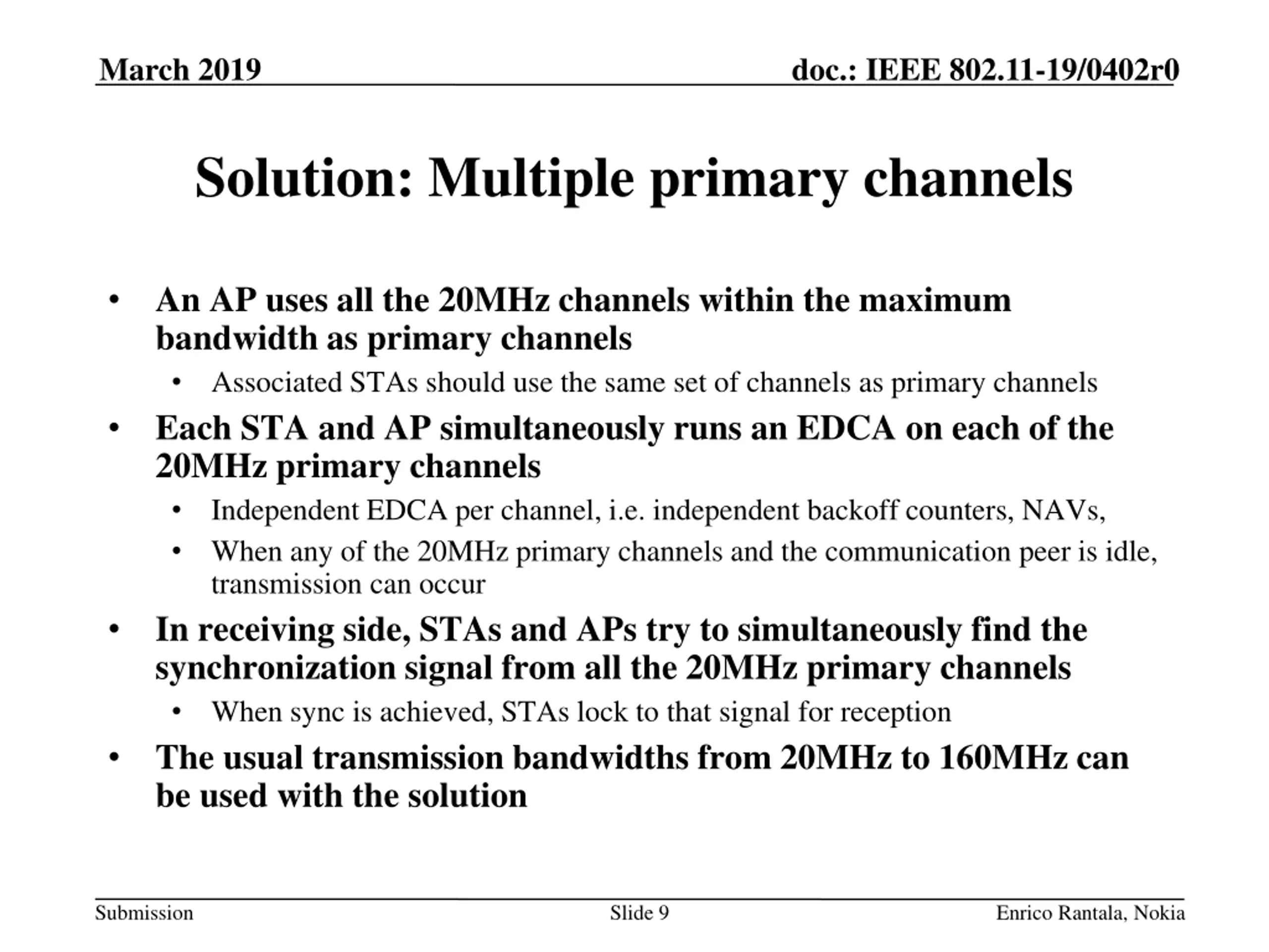 March 2019 doc.: IEEE 802.11-19/0402r0 Solution: Multiple primary channels An AP uses all the 20MHz channels within the maximum bandwidth as primary channels Associated STAs should use the same set of channels as primary channels Each STA and AP simultaneously runs an EDCA on each of the 20MHz primary channels Independent EDCA per channel, i.e. independent backoff counters, NAVs, When any of the 20MHz primary channels and the communication peer is idle, transmission can occur In receiving side, STAs and APs try to simultaneously find the synchronization signal from all the 20MHz primary channels When sync is achieved, STAs lock to that signal for reception The usual transmission bandwidths from 20MHz to 160MHz can be used with the solution Submission Slide 9 Enrico Rantala, Nokia