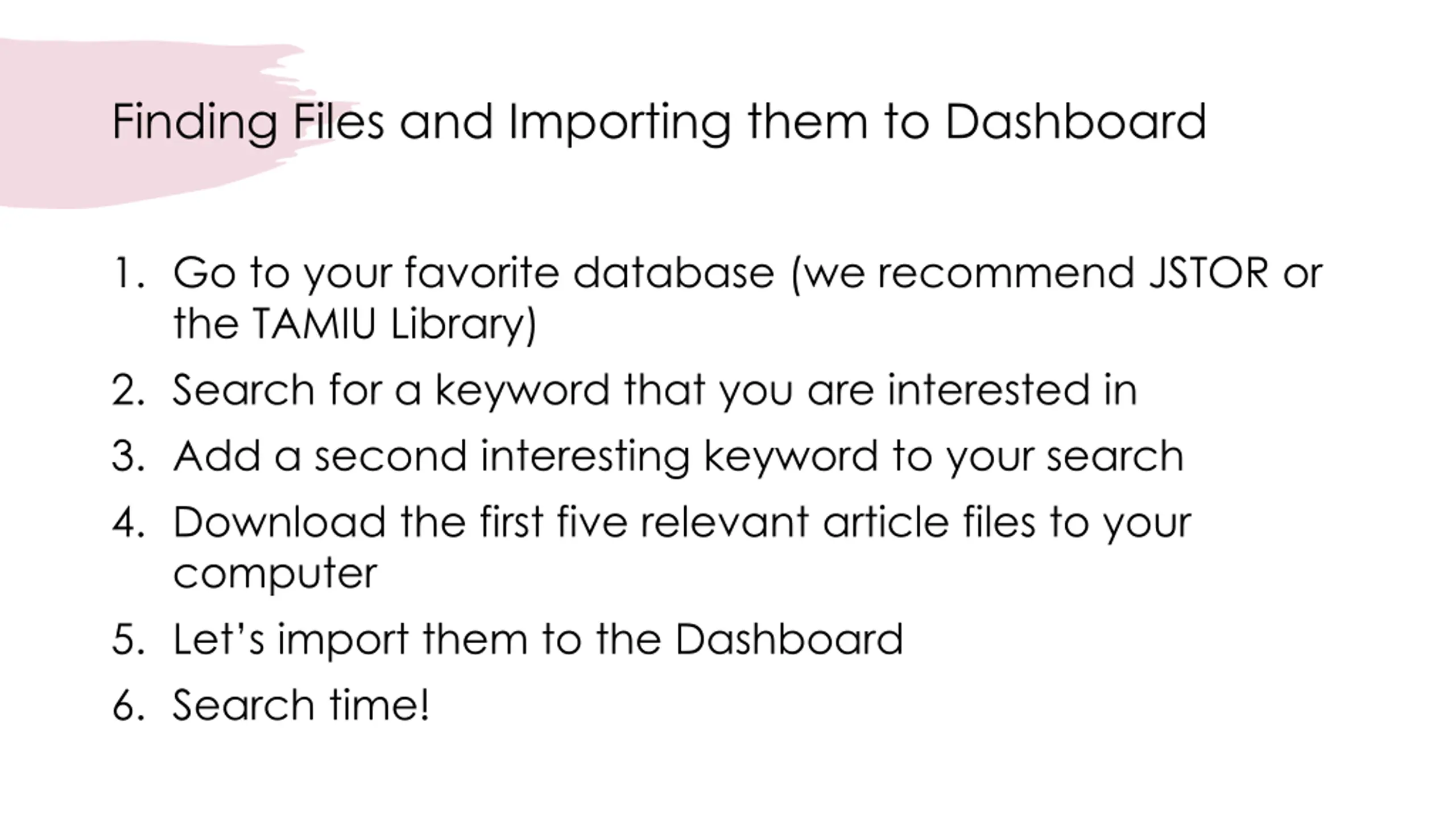 Finding Files and Importing them to Dashboard 1. Go to your favorite database (we recommend JSTOR or the TAMIU Library) 2. Search for a keyword that you are interested in 3. Add a second interesting keyword to your search 4. Download the first five relevant article files to your computer 5. Let s import them to the Dashboard 6. Search time!