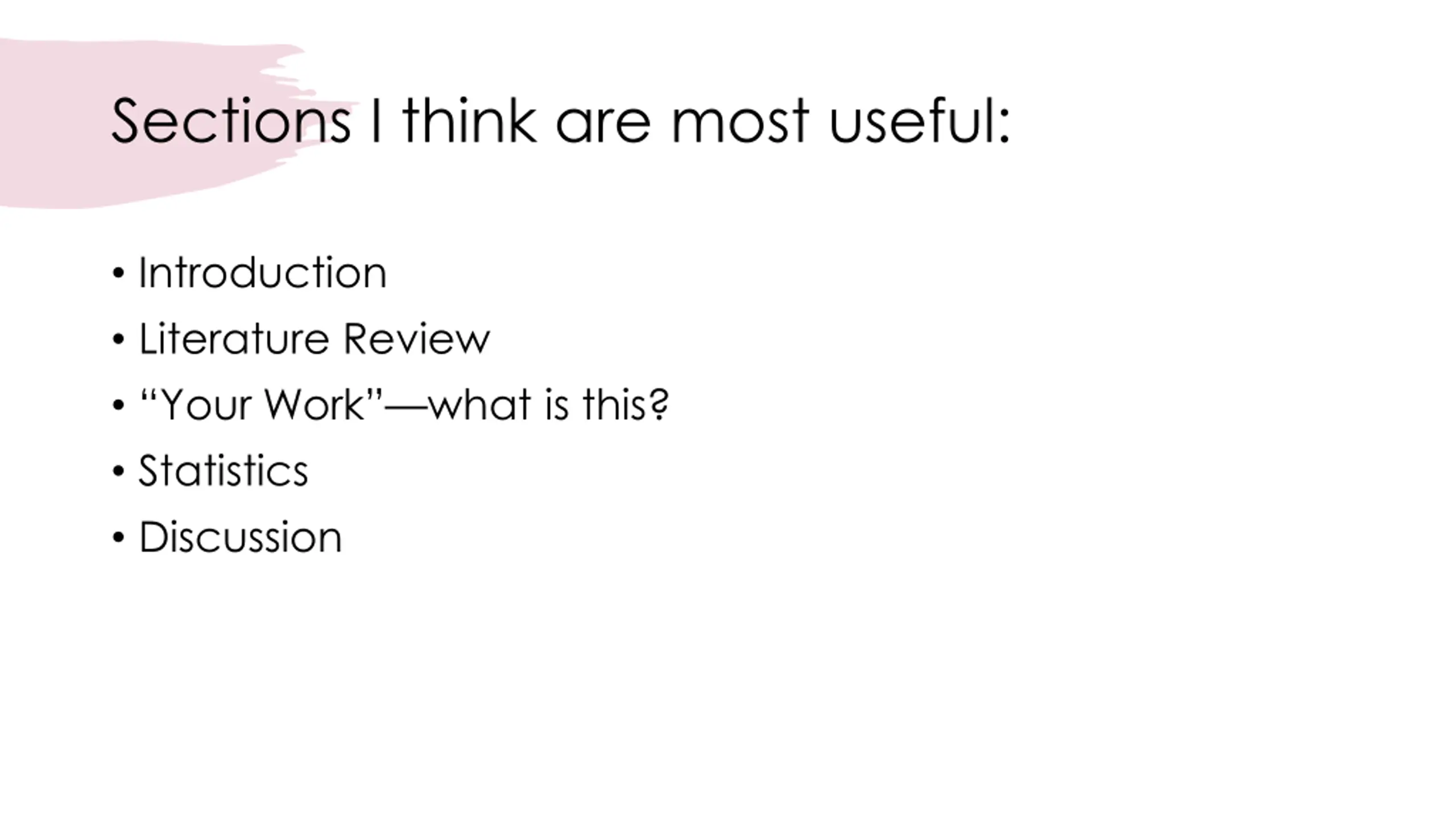 Sections I think are most useful: Introduction Literature Review Your Work what is this? Statistics Discussion
