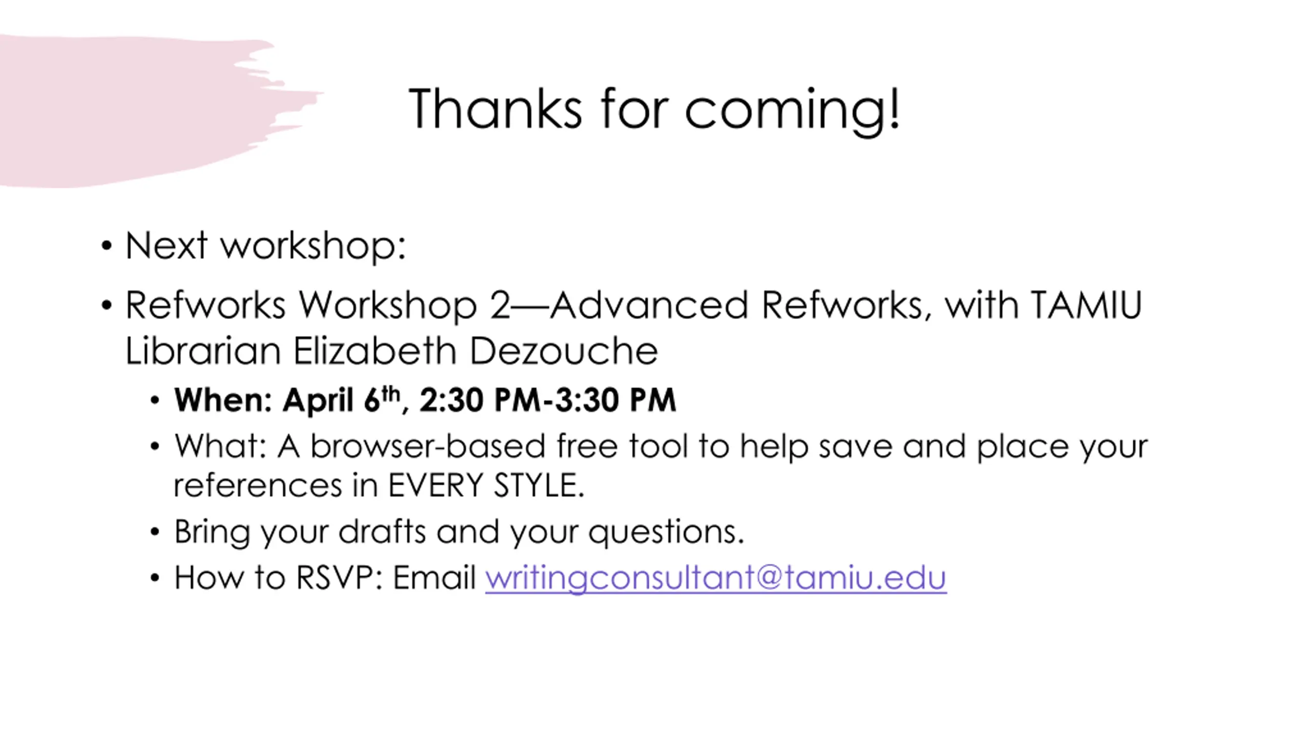 Thanks for coming! Next workshop: Refworks Workshop 2 Advanced Refworks, with TAMIU Librarian Elizabeth Dezouche When: April 6th, 2:30 PM-3:30 PM What: A browser-based free tool to help save and place your references in EVERY STYLE. Bring your drafts and your questions. How to RSVP: Email writingconsultant@tamiu.edu