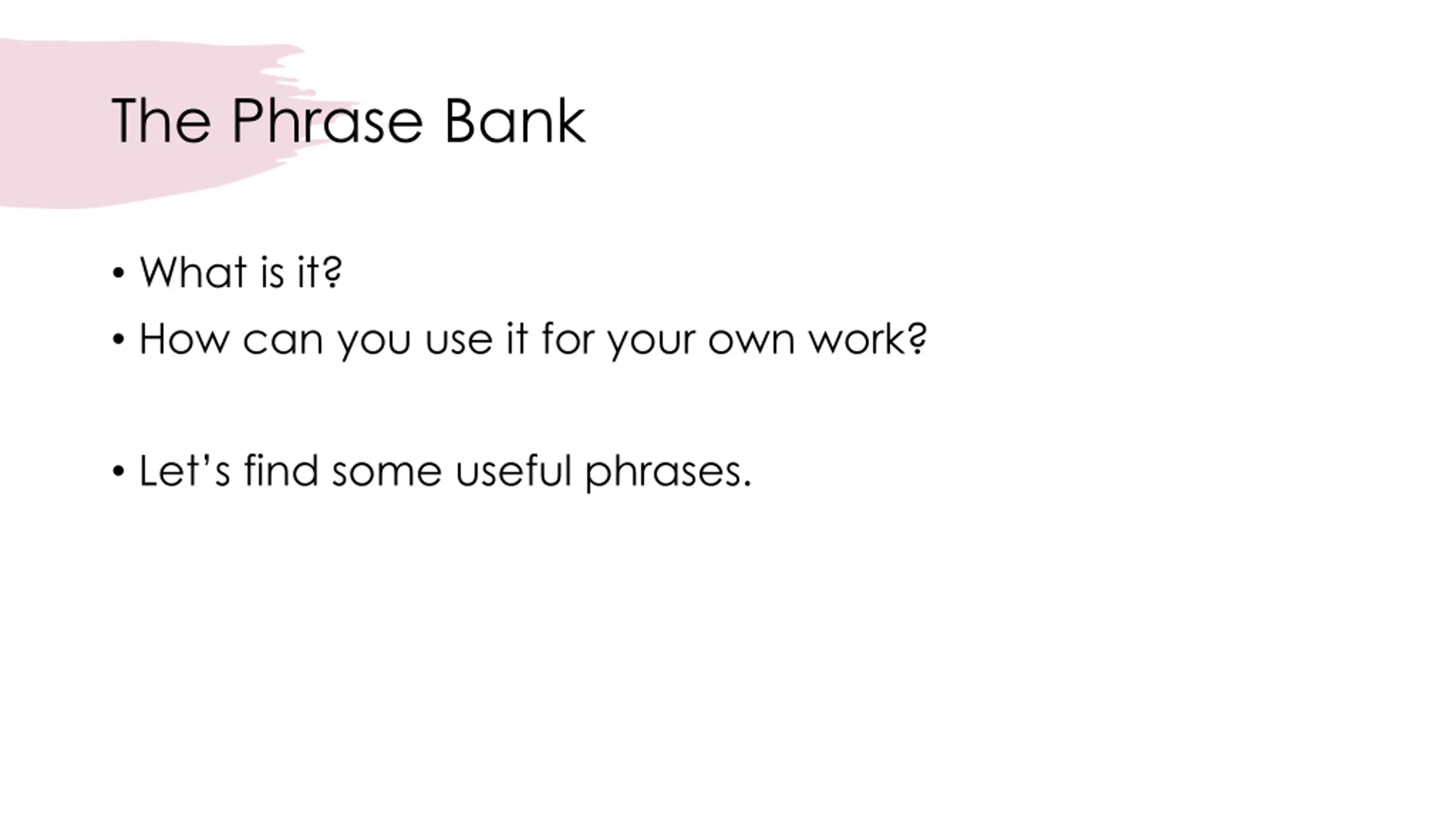 The Phrase Bank What is it? How can you use it for your own work? Let s find some useful phrases.