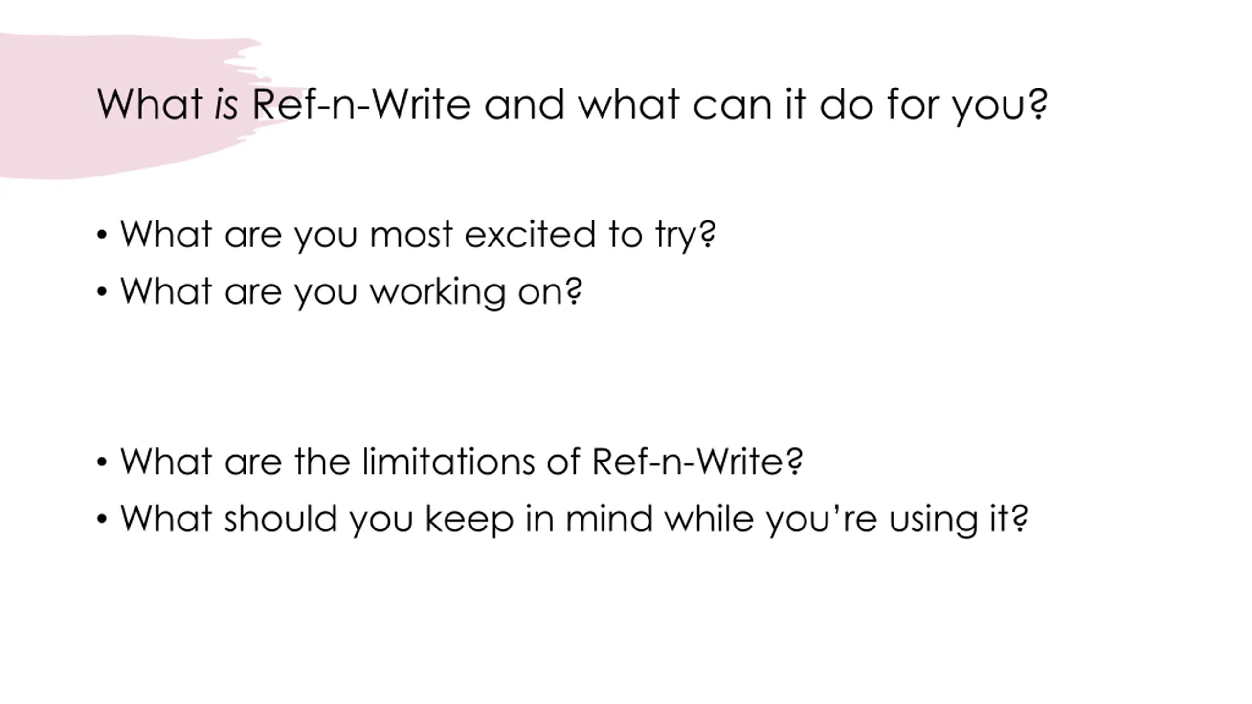 What is Ref-n-Write and what can it do for you? What are you most excited to try? What are you working on? What are the limitations of Ref-n-Write? What should you keep in mind while you re using it?