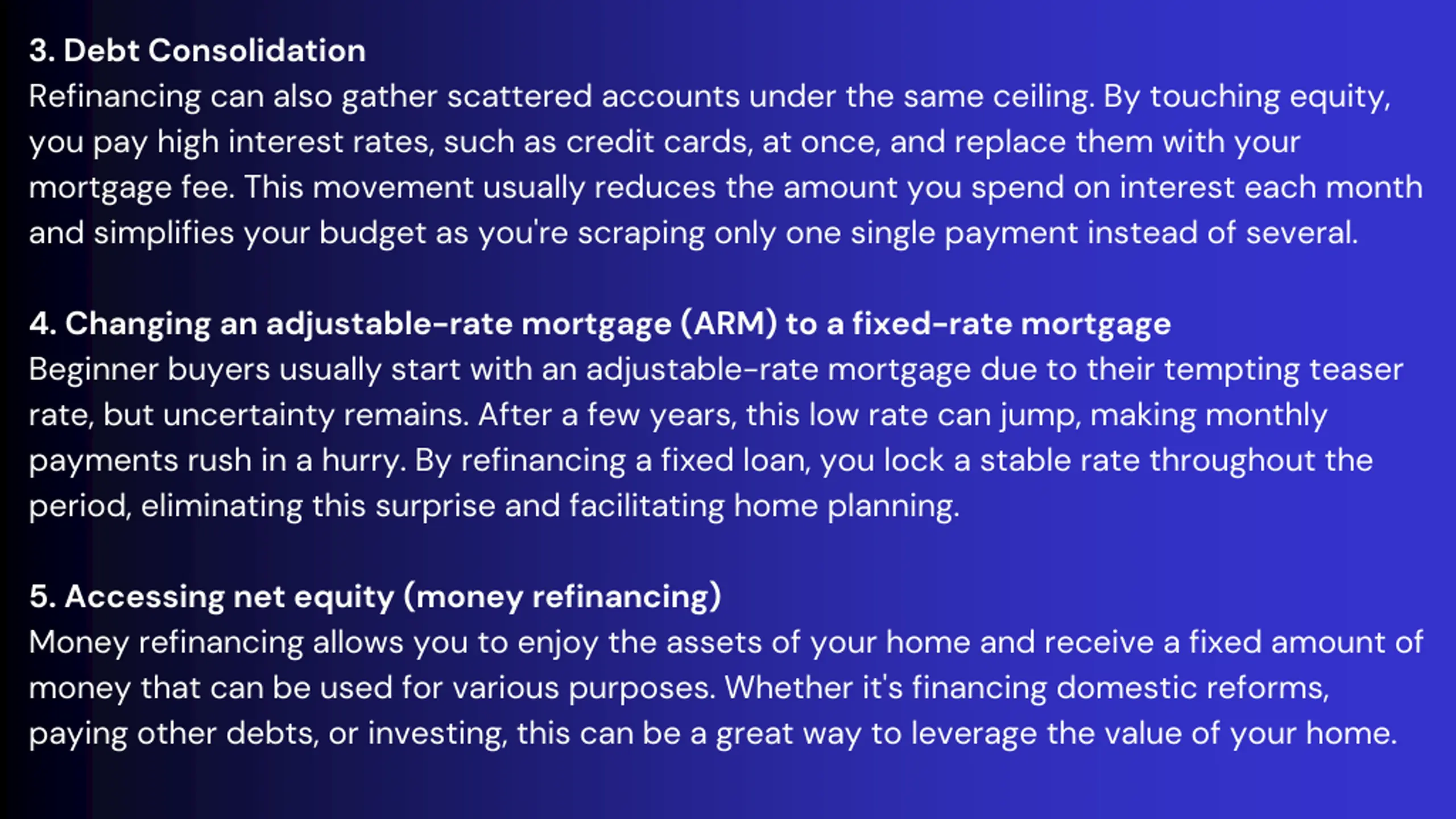 3. Debt Consolidation Refinancing can also gather scattered accounts under the same ceiling. By touching equity, you pay high interest rates, such as credit cards, at once, and replace them with your mortgage fee. This movement usually reduces the amount you spend on interest each month and simplifies your budget as you're scraping only one single payment instead of several. 4. Changing an adjustable-rate mortgage (ARM) to a fixed-rate mortgage Beginner buyers usually start with an adjustable-rate mortgage due to their tempting teaser rate, but uncertainty remains. After a few years, this low rate can jump, making monthly payments rush in a hurry. By refinancing a fixed loan, you lock a stable rate throughout the period, eliminating this surprise and facilitating home planning. 5. Accessing net equity (money refinancing) Money refinancing allows you to enjoy the assets of your home and receive a fixed amount of money that can be used for various purposes. Whether it's financing domestic reforms, paying other debts, or investing, this can be a great way to leverage the value of your home.