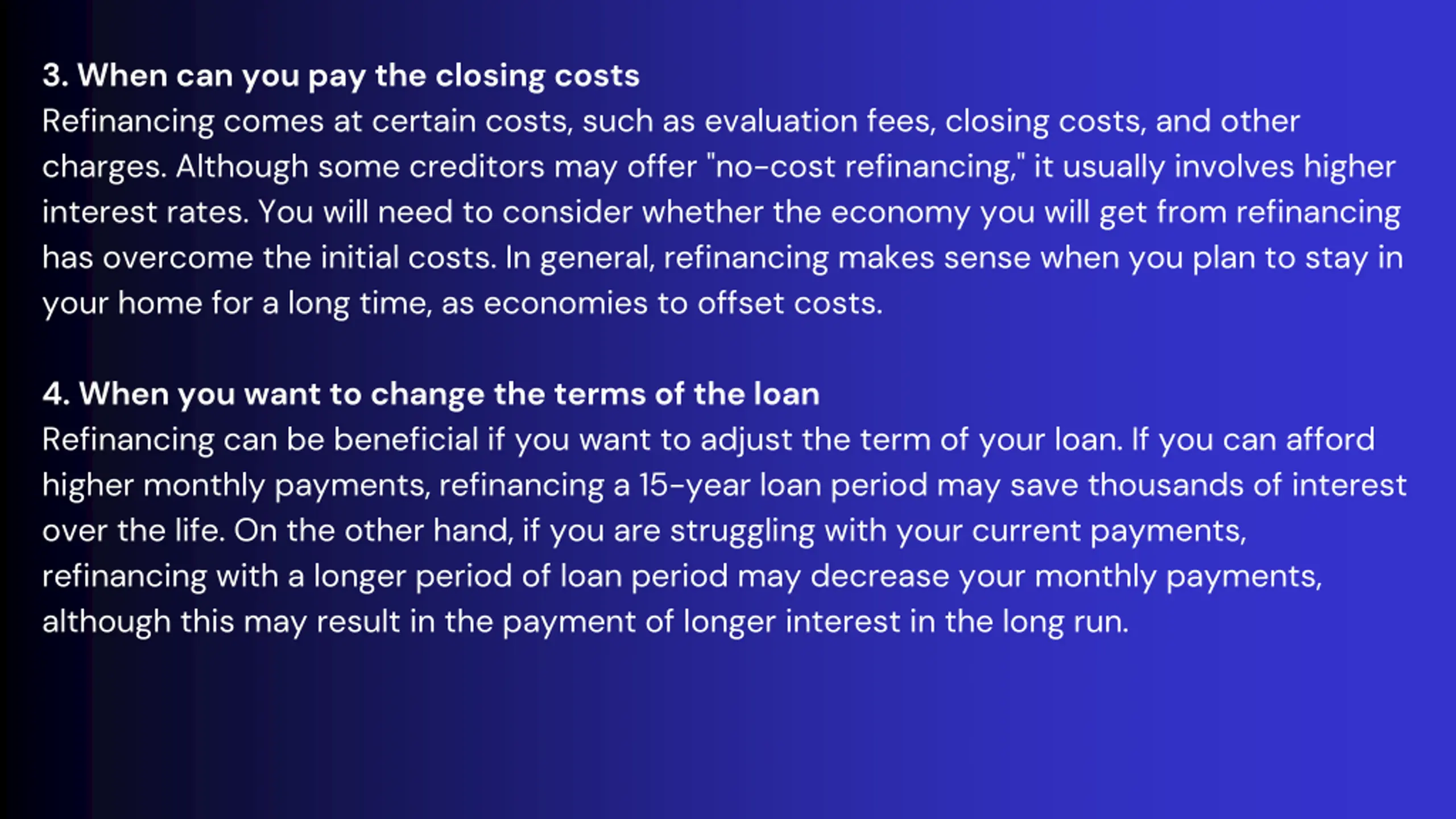 3. When can you pay the closing costs Refinancing comes at certain costs, such as evaluation fees, closing costs, and other charges. Although some creditors may offer "no-cost refinancing," it usually involves higher interest rates. You will need to consider whether the economy you will get from refinancing has overcome the initial costs. In general, refinancing makes sense when you plan to stay in your home for a long time, as economies to offset costs. 4. When you want to change the terms of the loan Refinancing can be beneficial if you want to adjust the term of your loan. If you can afford higher monthly payments, refinancing a 15-year loan period may save thousands of interest over the life. On the other hand, if you are struggling with your current payments, refinancing with a longer period of loan period may decrease your monthly payments, although this may result in the payment of longer interest in the long run.